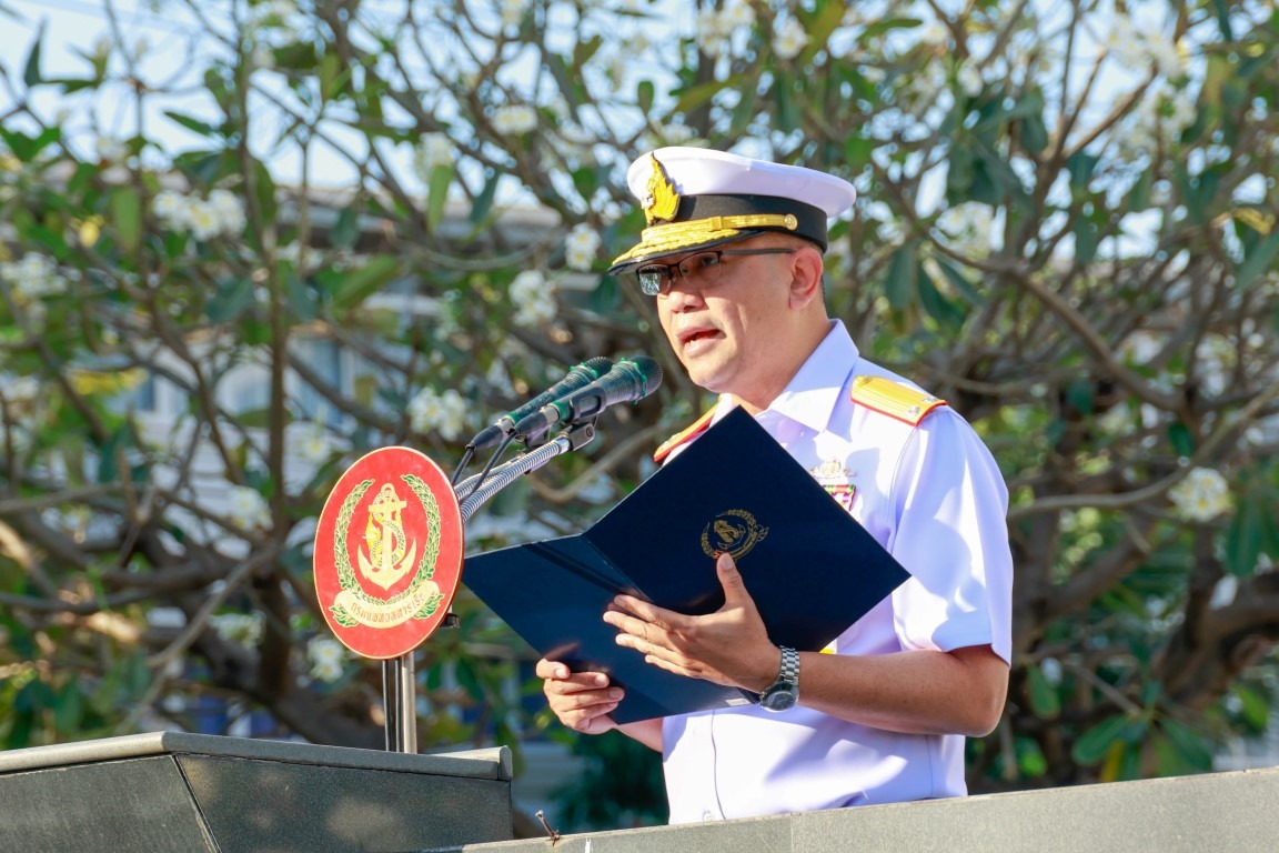 พลเรือตรี กิตตินันท์ งามศิลป์ รองเจ้ากรมแพทย์ทหารเรือ อ่านคำกล่าวของผู้บัญชาการทหารเรือ ในพิธีสดุดีวีรชน กองทัพเรือ ประจำปี ๒๕๖๘ หน้าแถวกำลังพลกรมแพทย์ทหารเรือ เมื่อ ๑๗ ม.ค.๖๘ ข่าวผู้บังคับบัญชา 17 มกราคม 2568