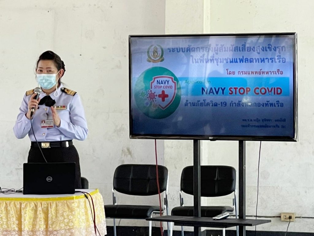 พลเรือตรีหญิง สุพิชชา แสงโชติ รองเจ้ากรมแพทย์ทหารเรือพร้อมคณะ ให้คำแนะนำและทำความเข้าใจการใช้งาน Application NAVY STOP COVID (ระบบคัดกรองผู้สัมผัสเสี่ยงสูงโรคโควิด-19 เชิงรุก) ให้กับเจ้าหน้าที่ที่ควบคุมดูแลบ้านพักและแฟลตทหารเรือ ในพื้นที่กรุงเทพฯ และปริมณฑล ณ สำนักงานแฟลตทุ่งมหาเมฆ และสำนักงานแฟลตสุขสวัสดิ์ ๒๖ เมื่อวันที่ ๑๗ พฤษภาคม พ.ศ.๒๕๖๔