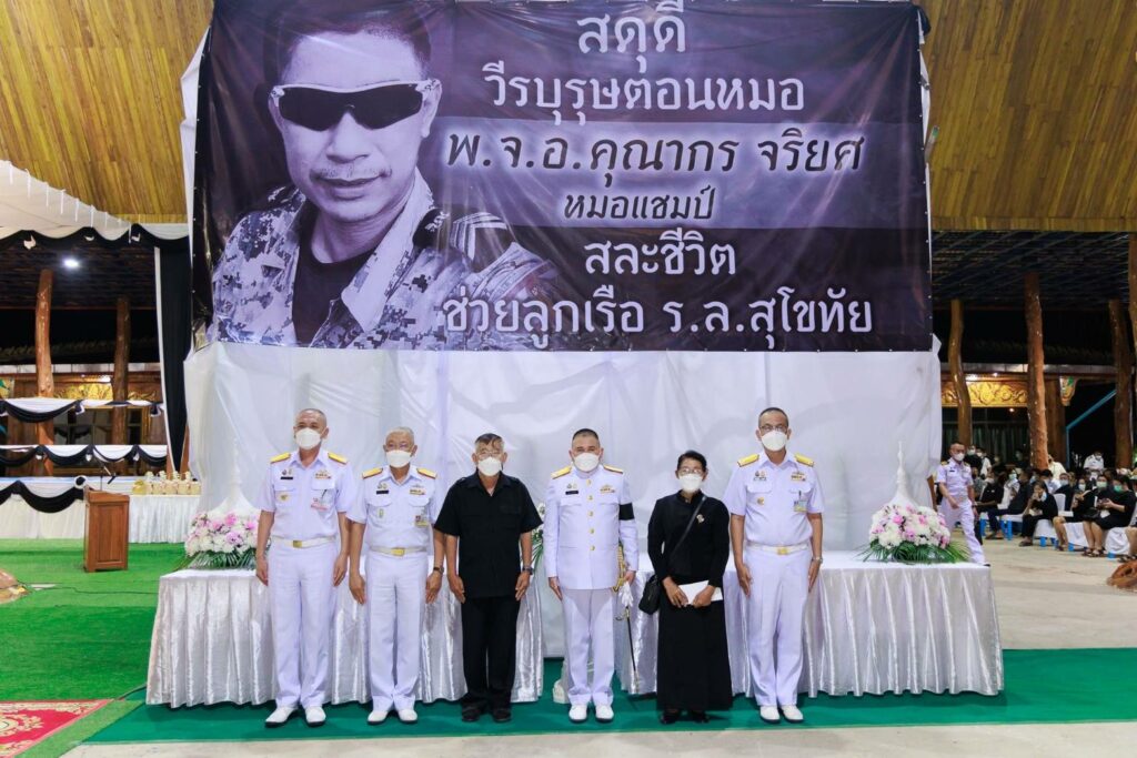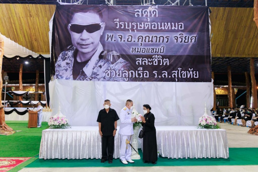 พลเรือโท ชลธร สุวรรณกิตติ เจ้ากรมแพทย์ทหารเรือ เป็นประธานสวดอภิธรรมศพ พ.จ.อ.คุณากร จริยศ ที่เสียชีวิตจากเหตุการณ์เรือหลวงสุโขทัยอับปาง โดยมี พลเรือตรี ณัฐ อิศรางกูร ณ อยุธยา ผู้อำนวยการโรงพยาบาลสมเด็จพระปิ่นเกล้า กรมแพทย์ทหารเรือ พลเรือตรี กิตตินันท์ งามศิลป์ ผู้อำนวยการโรงพยาบาลสมเด็จพระนางเจ้าสิริกิติ์ กรมแพทย์ทหารเรือ พลเรือตรี ประทีป ตังติสานนท์ ผู้อำนวยการโรงพยาบาลอาภากรเกียรติวงศ์ ฐานทัพเรือสัตหีบ และข้าราชการของกรมแพทย์ทหารเรือ เข้าร่วมฟังสวดฯ ณ วัดศรีวโนภาสสถิตย์พร ตำบลแกลง อำเภอเมือง จังหวัดระยอง เมื่อวันที่ ๓ มกราคม พ.ศ.๒๕๖๖