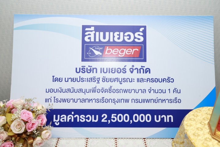 พลเรือโท ณัฐ อิศรางกูร ณ อยุธยา เจ้ากรมแพทย์ทหารเรือ และนาวาเอก ก่อพงศ์ หังสพฤกษ์ ผู้อำนวยการโรงพยาบาลทหารเรือกรุงเทพ กรมแพทย์ทหารเรือ รับมอบเงินบริจาค จำนวน ๒,๕๐๐,๐๐๐ บาท จากบริษัท เบเยอร์ จำกัด โดยมี และคุณสรินทร์ทิพย์ ชัยยศบูรณะ ประธานเจ้าหน้าที่สายงานสนับสนุน และดร.จารุรัตน์ ชัยยศบูรณะ ประธานเจ้าหน้าที่สายงานการเงิน เป็นผู้แทนคุณ ประเสริฐ ชัยยศบูรณะ และครอบครัว เพื่อจัดซื้อรถพยาบาลมอบให้โรงพยาบาลทหารเรือกรุงเทพ กรมแพทย์ทหารเรือ ณ ห้องรับรอง กองบังคับการกรมแพทย์ทหารเรือ เมื่อ ๘ พฤศจิกายน ๒๕๖๖