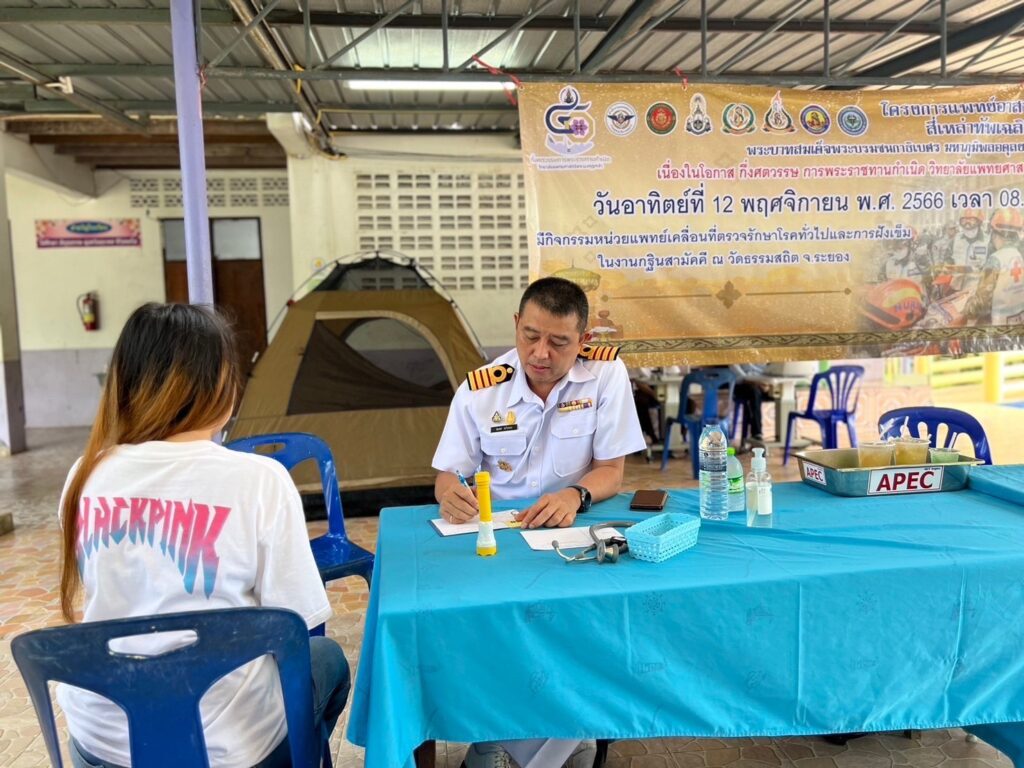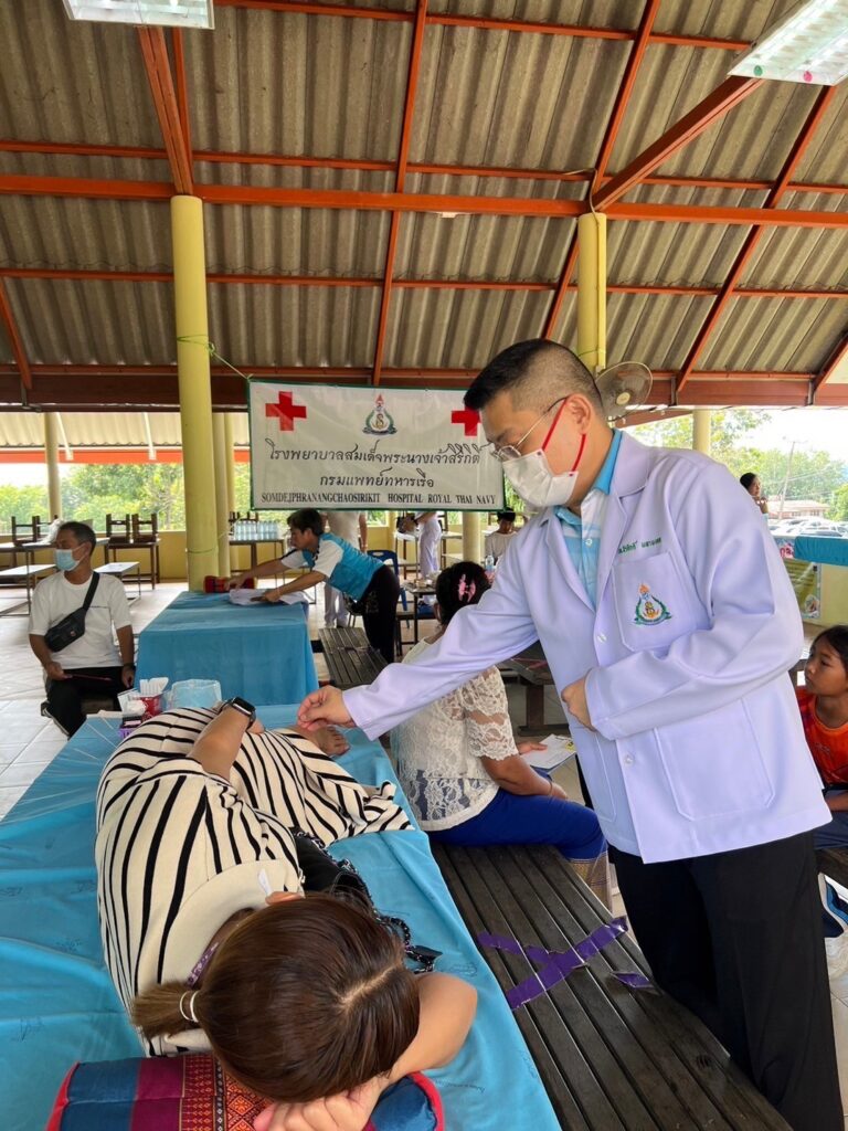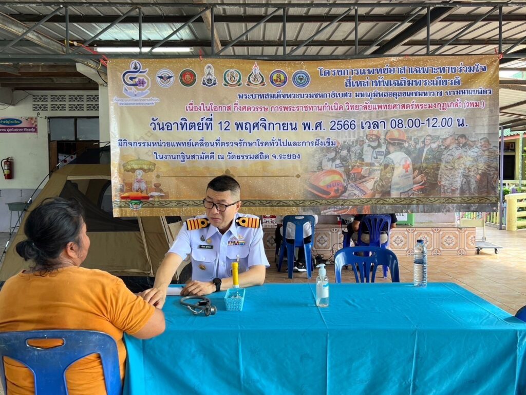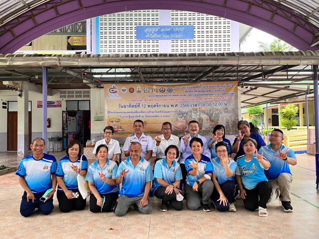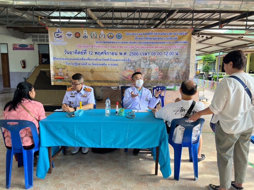 พลเรือตรี กิตตินันท์ งามศิลป์ รองเจ้ากรมแพทย์ทหารเรือ เข้าร่วมกิจกรรม โครงการแพทย์อาสาเฉพาะทางร่วมใจสี่เหล่าทัพเฉลิมพระเกียรติพระบาทสมเด็จพระบรมชนกาธิเบศร มหาภูมิพลอดุลยเดชมหาราช บรมนาถบพิตร จัดโดยโรงพยาบาลสมเด็จพระนางเจ้าสิริกิติ์ กรมแพทย์ทหารเรือ โดยมี นาวาเอก สมพร ระวิงทอง รองผู้อำนวยการโรงพยาบาลสมเด็จพระนางเจ้าสิริกิติ์ กรมแพทย์ทหารเรือ ฝ่ายสนับสนุน และนาวาเอกพัลลภ สุภากรณ์ รองผู้อำนวยการโรงพยาบาลสมเด็จพระนางเจ้าสิริกิติ์ กรมแพทย์ทหารเรือ ฝ่ายบริการสุขภาพ พร้อมคณะเข้าร่วมกิจกรรมฯ เนื่องในโอกาสกึ่งศตวรรษ การพระราชทานกำเนิด วิทยาลัยแพทยศาสตร์พระมงกุฎเกล้า (วพม) โดยจัดกิจกรรมหน่วยแพทย์เคลื่อนที่ ตรวจรักษาโรคทั่วไป และการฝังเข็ม ณ วัดธรรมสถิต จว.ระยอง เมื่อ ๑๒ พฤศจิกายน ๒๕๖๖