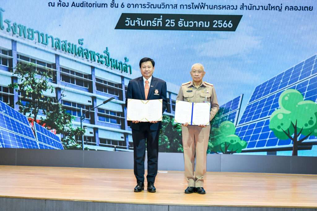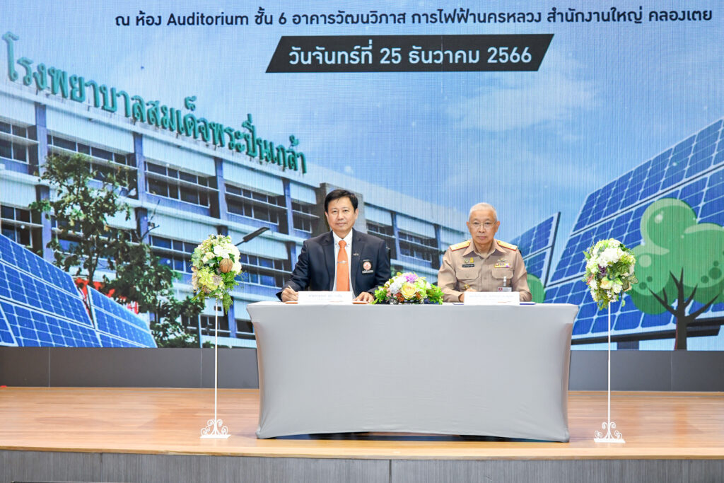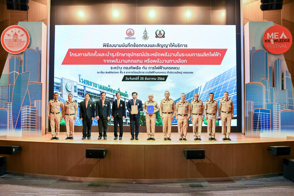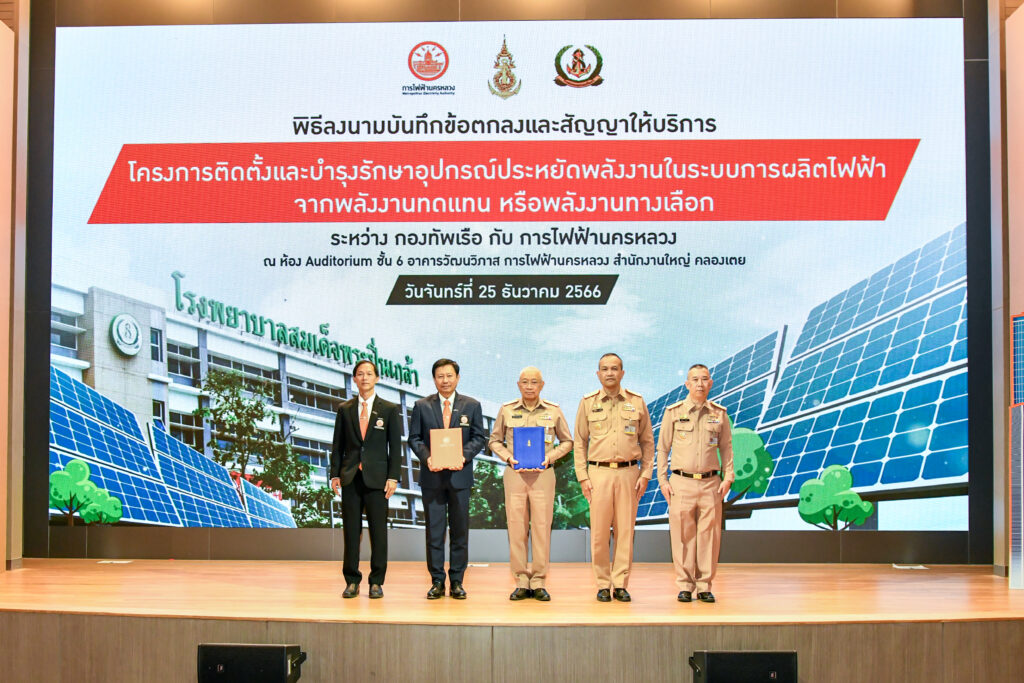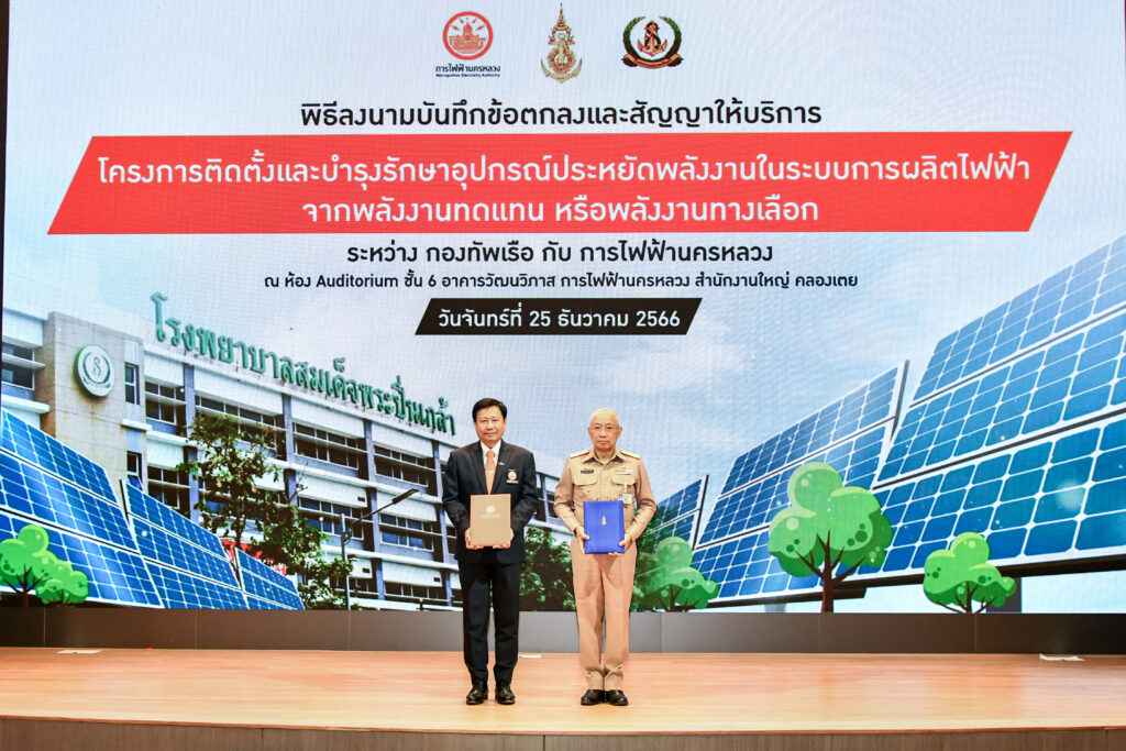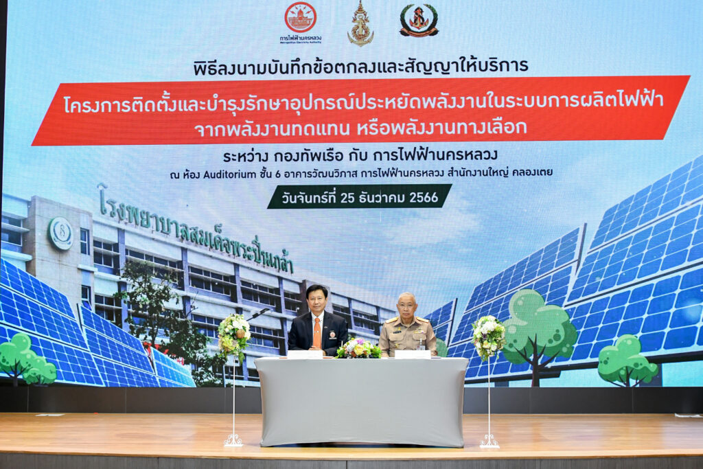 พลเรือโท ณัฐ อิศรางกูร ณ อยุธยา เจ้ากรมแพทย์ทหารเรือ ลงนามร่วมกับ คุณจาตุรงค์ สุริยาศศิน รองผู้ว่าการธุรกิจการไฟฟ้านครหลวง โครงการติดตั้งและบำรุงรักษาอุปกรณ์ประหยัดพลังงานในระบบการผลิตไฟฟ้าจากพลังงานทดแทน หรือพลังงานทางเลือกในพื้นที่โรงพยาบาลสมเด็จพระปิ่นเกล้า กรมแพทย์ทหารเรือ ระหว่างกองทัพเรือกับการไฟฟ้านครหลวง โดยมี พลเรือตรี กิตตินันท์ งามศิลป์ รองเจ้ากรมแพทย์ทหารเรือ พลเรือตรี วสุธา ข่ายแก้ว ผู้อำนวยการโรงพยาบาลสมเด็จพระปิ่นเกล้า กรมแพทย์ทหารเรือ พร้อมด้วยผู้แทนจากหน่วยเกี่ยวข้องต่างๆ ของกองทัพเรือ เข้าร่วมพิธีฯ ณ ห้อง Auditorium อาคารวัฒนวิภาส การไฟฟ้านครหลวง ชั้น ๖ สำนักงานใหญ่ คลองเตย เมื่อ ๒๕ ธันวาคม ๒๕๖๖