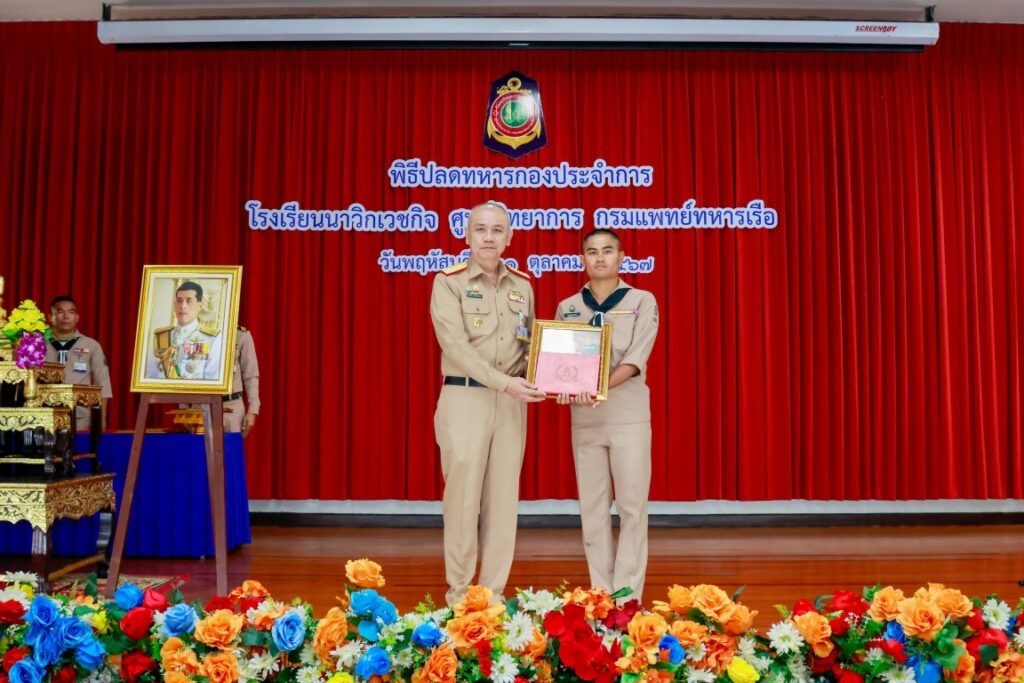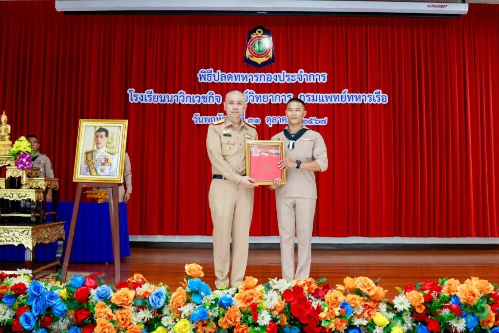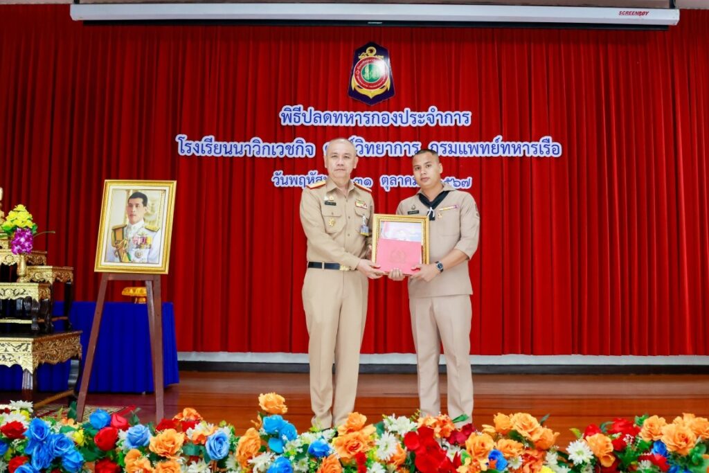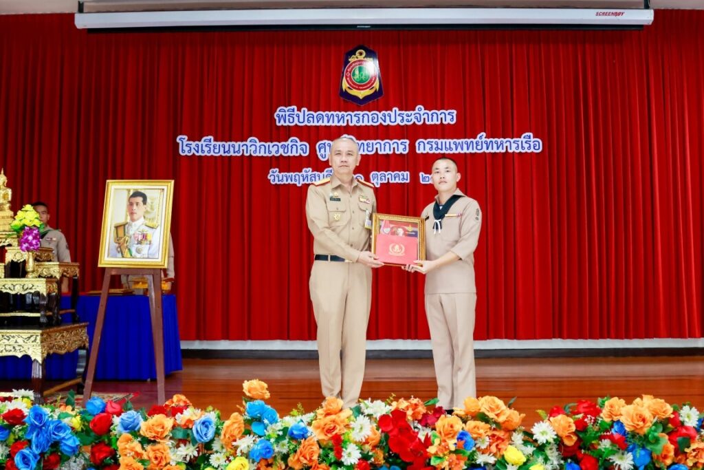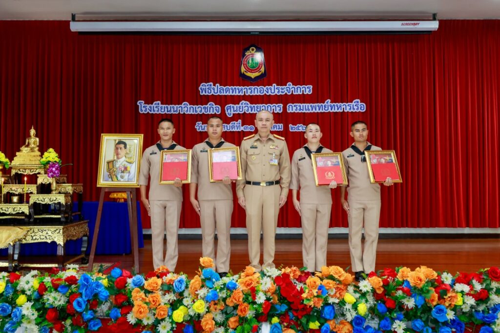 พลเรือโท ประทีป ตังติสานนท์ เจ้ากรมแพทย์ทหารเรือ เป็นประธานในพิธีปลดทหารกองประจำการ ผลัดที่ ๓/๒๕๖๖ และ ผลัดที่ ๑/๒๕๖๗ จำนวน ๔ นาย โดยมีข้าราชการโรงเรียนนาวิกเวชกิจ ศูนย์วิทยาการ กรมแพทย์ทหารเรือ เข้าร่วมพิธีฯ ณ ห้องประชุมนาวิกเวชกิจ ๑ โรงเรียนนาวิกเวชกิจ ศูนย์วิทยาการ กรมแพทย์ทหารเรือ เมื่อวันที่ ๓๑ ตุลาคม พ.ศ.๒๕๖๗