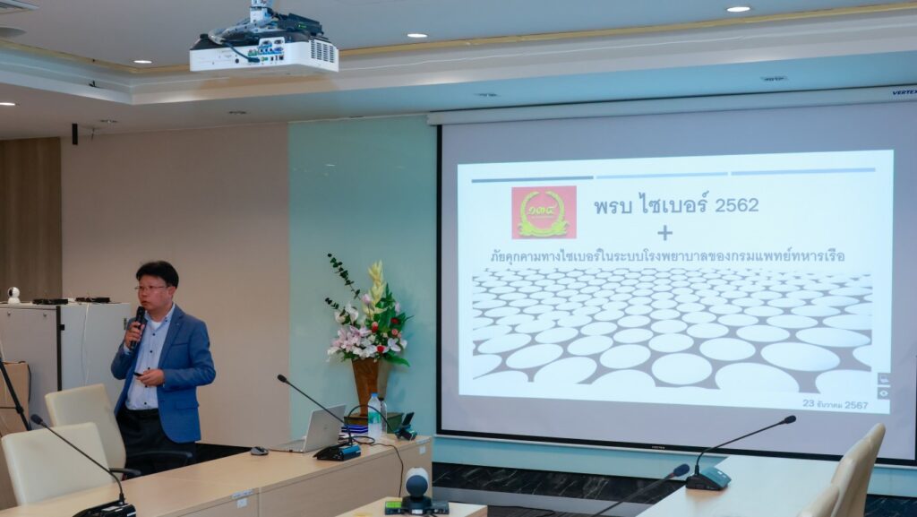 พลเรือตรี เรวัตร กิจณรงค์ รองเจ้ากรมแพทย์ทหารเรือ เป็นประธานการจัดบรรยายการสร้างความตระหนักรู้และความเข้าใจแนวคิดเกี่ยวกับความมั่นคงปลอดภัยไซเบอร์ (พ.ร.บ.ไซเบอร์ พ.ศ.๒๕๖๒) เมื่อ ๒๓ ธ.ค.๖๗