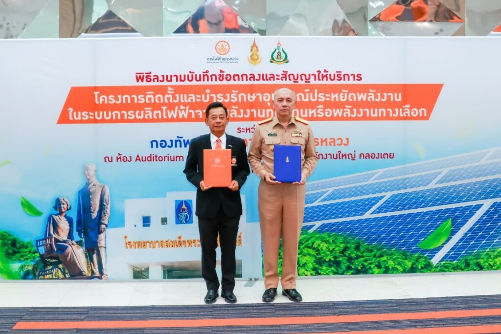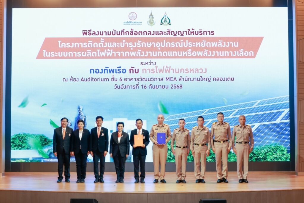 พลเรือโท ประทีป ตังติสานนท์ เจ้ากรมแพทย์ทหารเรือ เป็นผู้แทนผู้บัญชาการทหารเรือ ร่วมพิธีลงนามบันทึกข้อตกลงและสัญญาให้บริการโครงการติดตั้งและบำรุงรักษาอุปกรณ์ประหยัดพลังงานในระบบการผลิตไฟฟ้าจากพลังงานทดแทนหรือพลังงานทางเลือก ระหว่าง กองทัพเรือ โดยกรมแพทย์ทหารเรือ กับ การไฟฟ้านครหลวง โดยมี ผู้บังคับบัญชาของกรมแพทย์ทหารเรือและกองทัพเรือ ข้าราชการกรมแพทย์ทหารเรือ และเจ้าหน้าที่การไฟฟ้านครหลวง ร่วมพิธีฯ ณ ห้อง Auditorium ชั้น ๖ อาคาร วัฒนวิภาส การไฟฟ้านครหลวง สำนักงานใหญ่ คลองเตย เมื่อวันที่ ๑๖ กันยายน พ.ศ.๒๕๖๘