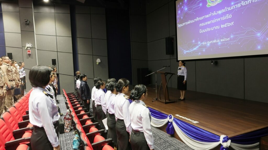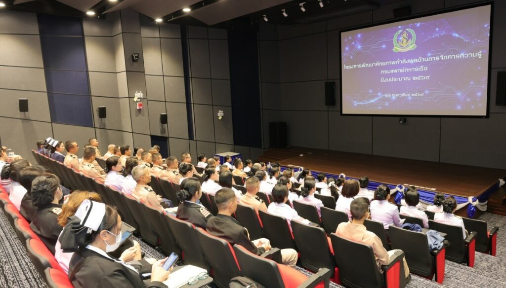 พลเรือตรีหญิง จีระวัฒน์ กฤษณพันธ์ ว่องวิทย์ รองเจ้ากรมแพทย์ทหารเรือ เป็นประธานในพิธีเปิดโครงการพัฒนาศักยภาพกำลังพลด้านการจัดการความรู้ กรมแพทย์ทหารเรือ ประจำปีงบประมาณ ๒๕๖๙ โดยมีวัตถุประสงค์เพื่อเสริมสร้างความรู้ ความเข้าใจ และทักษะด้านการจัดการความรู้แก่บุคลากร ให้สามารถนำไปประยุกต์ใช้ในการขับเคลื่อนงานภายในหน่วยงานอย่างเป็นรูปธรรม อันจะนำไปสู่การพัฒนาแนวปฏิบัติที่เป็นเลิศ ตลอดจนการสร้างสรรค์นวัตกรรมเพื่อยกระดับคุณภาพและศักยภาพการให้บริการทางการแพทย์ของกองทัพเรือ ให้มีประสิทธิภาพยิ่งขึ้น โดยได้รับเกียรติจากอาจารย์ สรยุทธ อังคณานุกิจ เป็นวิทยากรฯ ณ ห้องประชุมเธียเตอร์ชั้น ๑๓ อาคารผู้ป่วยใน ๑๔ ชั้น โรงพยาบาลสมเด็จพระปิ่นเกล้ากรมแพทย์ทหารเรือ เมื่อวันที่ ๑๘ กุมภาพันธ์ พ.ศ.๒๕๖๙