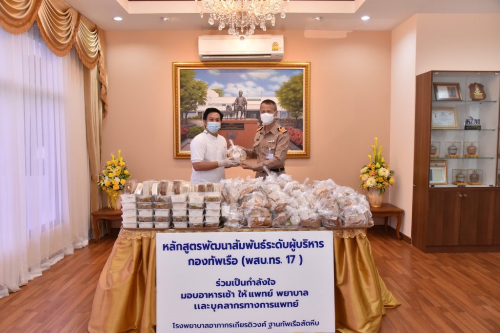 เมื่อวันที่ 16 ส.ค.64 น.อ.ไพบูลย์ เทพประสิทธิ์ หก.สนับสนุนการรักษาพยาบาล รพ.อาภากรเกียรติวงศ์ ฐท.สส. รับมอบอาหารเช้า จำนวน 100 กล่อง จากหลักสูตรพัฒนาสัมพันธ์ระดับผู้บริหาร กองทัพเรือ (พสบ.ทร.17) และรับมอบชุดปาท่องโก๋ จำนวน 100 ชุด จากโรงแรมราวินทรา บีช รีสอร์ท แอนด์ สปา เพื่อร่วมเป็นกำลังใจให้แพทย์ พยาบาล และบุคลากรทางการแพทย์ รพ.อาภากรเกียรติวงศ์ ฐท.สส. ณ ห้องรับรองอาภากรเกียรติวงศ์ / ข่าวบริจาค / By หน่วยขึ้นตรง จำนวนคนดู : 12