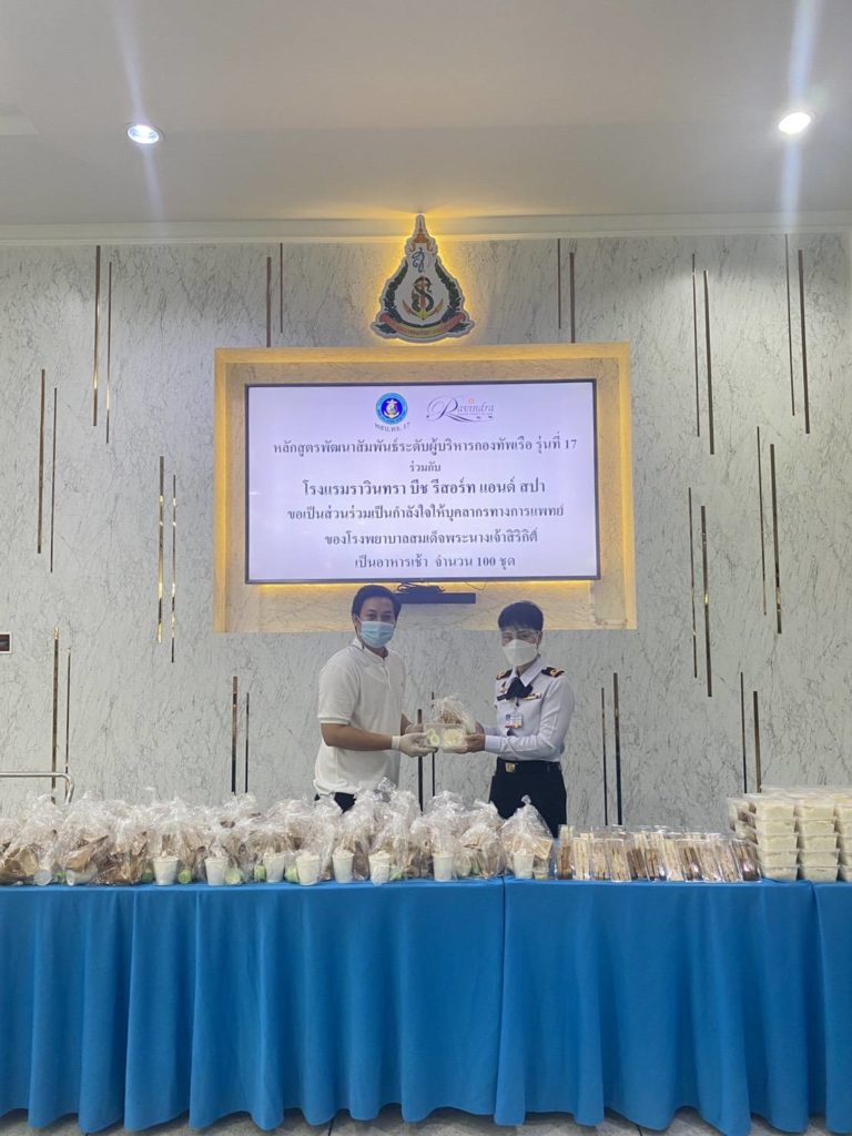 เมื่อวันที่ 16 ส.ค.64 หลักสูตรพัฒนาสัมพันธ์ระดับผู้บริหาร กองทัพเรือ รุ่น 17 ร่วมกับ โรงแรมราวินทรา บีช รีสอร์ท แอนด์ สปา ได้สนับสนุนอาหารกล่อง 100 กล่อง และชุดอาหารเช้า จำนวน 100 ชุด เพื่อเป็นกำลังใจให้กับบุคลากรทางการแพทย์และเจ้าหน้าที่ รพ.สมเด็จพระนางเจ้าสิริกิติ์ พร. ที่ปฏิบัติหน้าที่ในสถานการณ์ COVID-19 ณ ห้องโถงอาคารผู้ป่วยนอก / ข่าวบริจาค / By หน่วยขึ้นตรง จำนวนคนดู : 7