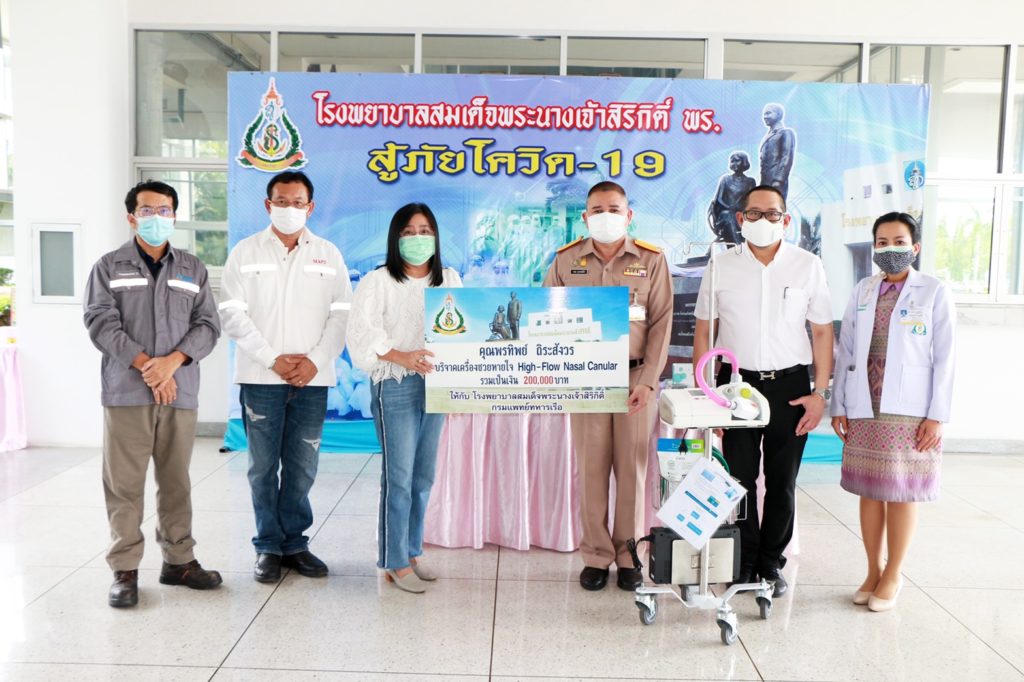เมื่อวันที่ 26 ส.ค.64 พล.ร.ต.ชลธร สุวรรณกิตติ ผอ.รพ.สมเด็จพระนางเจ้าสิริกิติ์ พร., น.อ.สราวุธ พลเสน และ น.อ.หญิง รุจิเรข ธรรมเจริญ รับมอบเครื่องช่วยหายใจชนิด High flow nasal canular มูลค่า 200,000 บาท จากคุณ พรทิพย์ ถิระสังวร และคณะ ให้กับมูลนิธิโรงพยาบาลสมเด็จพระนางเจ้าสิริกิติ์ กองทัพเรือ ในพระบรมราชินูปถัมภ์ เพื่อใช้สำหรับดูแลผู้ป่วย COVID-19 ณ ห้องโถงชั้นล่าง ตึกอำนวยการ รพ.สมเด็จพระนางเจ้าสิริกิติ์ พร.