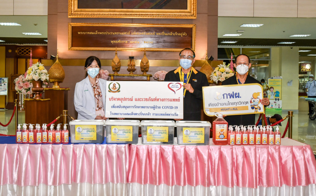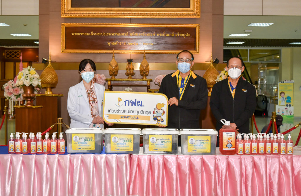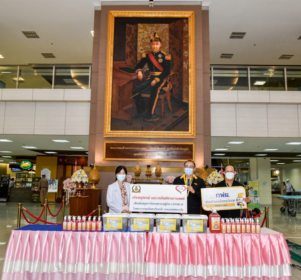 เมื่อวันที่ 27 ส.ค.64 น.อ.หญิง พิมพ์สิริ ชมะนันทน์ ผอ.ศูนย์รับบริจาค รพ.สมเด็จพระปิ่นเกล้า พร. รับมอบหมวกป้องกันเชื้อ PAPR พร้อมชุดกรองจ่ายอากาศบริสุทธิ์ จำนวน 4 ชุด, เจลแอลกอฮอล์ล้างมือ ขนาด 5 ลิตร จำนวน 1 แกลลอน และขนาด 450 มิลลิลิตร จำนวน 30 ขวด จาก การไฟฟ้าฝ่ายผลิตแห่งประเทศไทย (กฟผ.) เพื่อสนับสนุนการปฏิบัติงานดูแลรักษาผู้ป่วย COVID-19 การนี้ ทพ.อาทิตย์ อุดมศักดิ์ ผอ.ฝ่ายแพทย์และอนามัย กฟผ. เป็นผู้แทนมอบ ณ อาคารผู้ป่วยนอก รพ.ฯ / ข่าวบริจาค / By หน่วยขึ้นตรง จำนวนคนดู : 5
