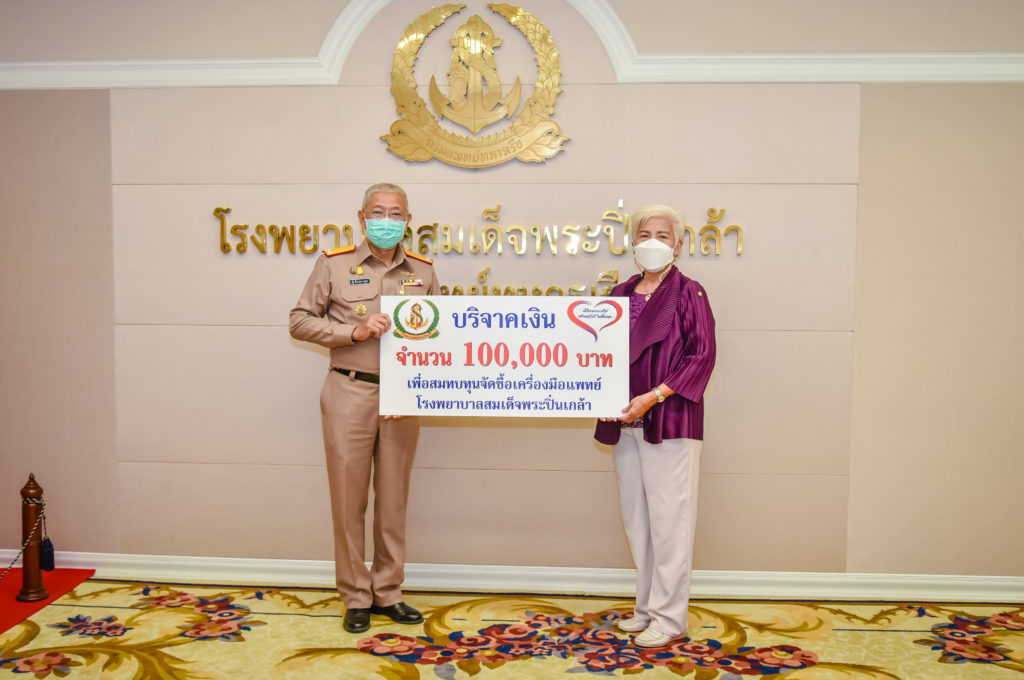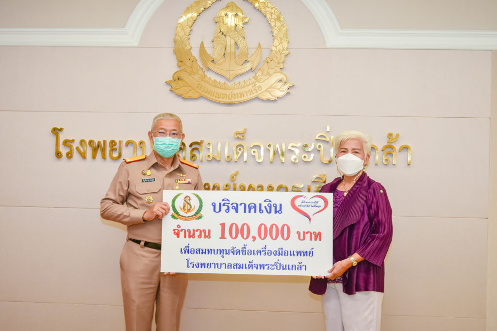 พลเรือตรี ณัฐ อิศรางกูร ณ อยุธยา ผู้อำนวยการโรงพยาบาลสมเด็จพระปิ่นเกล้า กรมแพทย์ทหารเรือ รับมอบเงินบริจาค จำนวน ๑๐๐,๐๐๐ บาท จาก คุณนชาพร แซ่เหลี่ยน เพื่อจัดซื้อเครื่องมือแพทย์ให้โรงพยาบาลสมเด็จพระปิ่นเกล้า ณ ห้องรับรอง สำนักงานผู้อำนวยการ โรงพยาบาลสมเด็จพระปิ่นเกล้า กรมแพทย์ทหารเรือ เมื่อวันที่ ๙ พฤศจิกายน ๒๕๖๔