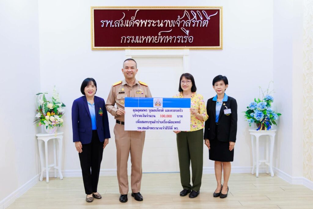 เมื่อ ๑๔ มิ.ย.๖๖ คุณอุดมพร บุณยเกียรติ และครอบครัว มอบเงินบริจาคจำนวน ๑๐๐,๐๐๐ บาท สมทบทุนผ้าป่ามหากุศล เพื่อจัดซื้อเครื่องมือแพทย์ โดยมี พล.ร.ต.กิตตินันท์ งามศิลป์ ผอ.รพ.สมเด็จพระนางเจ้าสิริกิติ์ พร. เป็นผู้รับมอบ ณ ห้อง ๑๙ ปี อาคารอำนวยการ ชั้น ๒ รพ.สมเด็จพระนางเจ้าสิริกิติ์ พร. / ข่าวบริจาค / By ข่าวผู้บังคับบัญชา จำนวนคนดู : 5