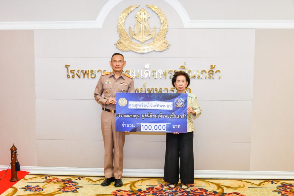 เมื่อ ๒๘ ต.ค.๖๗ คุณสุพรรัตน์ ฉัตร์ทิพานนท์ มอบเงินบริจาคจำนวน ๑๐๐,๐๐๐ บาท สมทบทุนมูลนิธิสมเด็จพระปิ่นเกล้า โดยมี พล.ร.ต.สมชาย จันทโรธร ผอ.รพ.สมเด็จพระปิ่นเกล้า พร. เป็นผู้รับมอบ ณ ห้องรับรอง สนง.ผอ.รพ.สมเด็จพระปิ่นเกล้า พร.