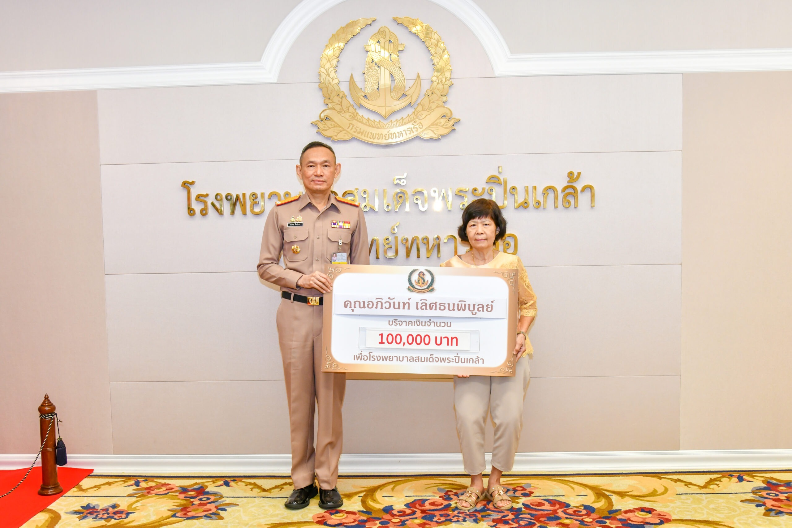 เมื่อ ๑ พ.ย.๖๗ คุณวัฒนี เลิศธนพิบูลย์ มอบเงินบริจาคจำนวน ๑๐๐,๐๐๐ บาท เพื่อพัฒนาบริการทางการแพทย์ รพ.สมเด็จพระปิ่นเกล้า พร. โดยมี พล.ร.ต.สมชาย จันทโรธร ผอ.รพ.สมเด็จพระปิ่นเกล้า พร. เป็นผู้รับมอบ ณ ห้องรับรอง สนง.ผอ.รพ.สมเด็จพระปิ่นเกล้า พร. ข่าวผู้บังคับบัญชา 6 พฤศจิกายน 2567