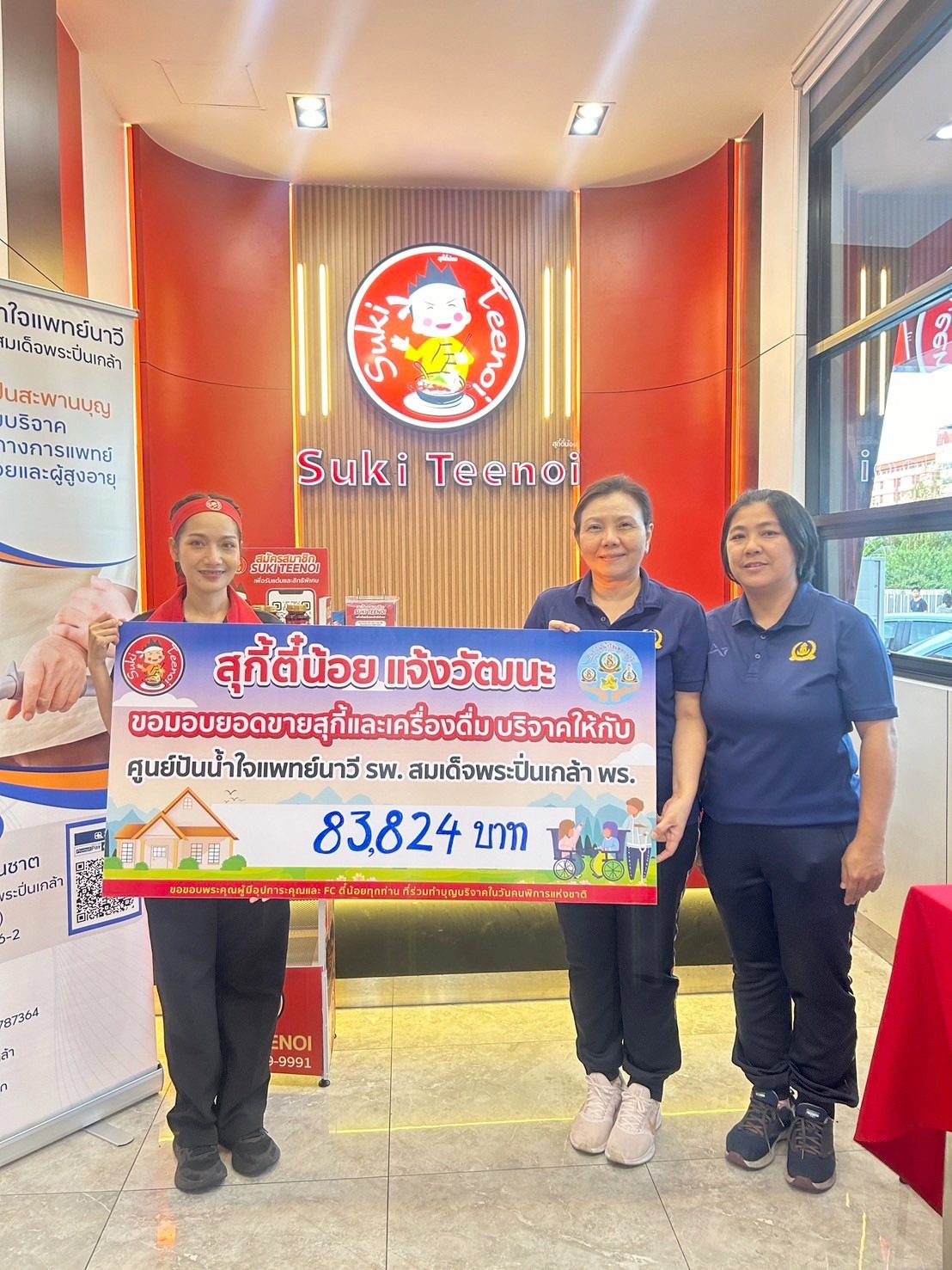 เมื่อ ๙ พ.ย.๖๘ ร้านสุกี้ตี๋น้อย สาขาแจ้งวัฒนะ จัดกิจกรรมทำบุญบริจาควันคนพิการแห่งชาติ ปี ๒๕๖๗ โดยมอบ ยอดขายสุกี้และเครื่องดื่ม บริจาคให้กับศูนย์ปันน้ำใจแพทย์นาวี รพ.สมเด็จพระปิ่นเกล้า พร. จำนวน ๘๓,๘๒๔ บาท โดยมี น.ท.หญิง เย็นฤดี เสตะกสิกร รอง ผอ.ศูนย์รับบริจาค รพ.สมเด็จพระปิ่นเกล้า พร. และ น.ต.หญิง สรวงสุดา แนวจิตร หน.แผนกรับบริจาค รพ.ฯ เป็นผู้รับมอบ ณ ร้านสุกี้ตี๋น้อย สาขาแจ้งวัฒนะ กรุงเทพฯ ข่าวผู้บังคับบัญชา 12 พฤศจิกายน 2567