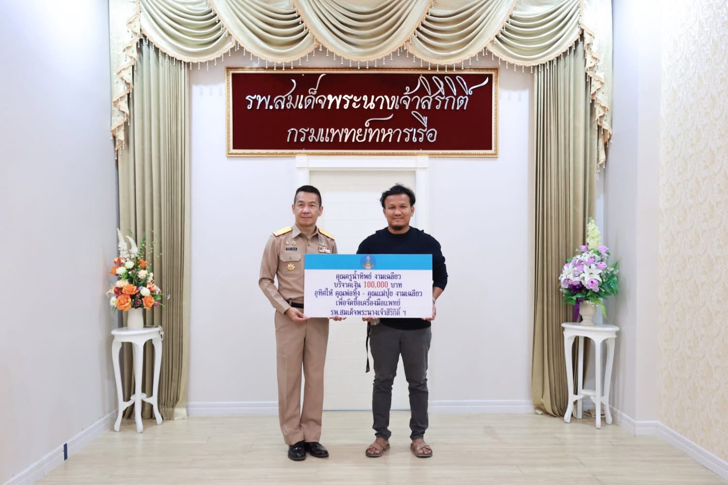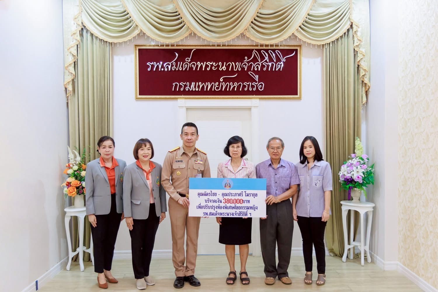 เมื่อ ๒๒ พ.ค.๖๘ คุณฉัตรไชย – คุณประภาศรี โมรากุล บริจาคเงินจำนวน ๓๘๐,๐๐๐ บาท เพื่อปรับปรุงห้องพิเศษศัลยกรรมหญิง รพ.สมเด็จพระนางเจ้าสิริกิติ์ พร. โดยมี พล.ร.ต.ตรี พัฒนชัย เฉลิมวรรณ์ ผอ.รพ.สมเด็จพระนางเจ้าสิริกิติ์ พร. เป็นผู้รับมอบ ณ ห้อง ๑๙ ปี อาคารอำนวยการ รพ.ฯ ข่าวผู้บังคับบัญชา 26 พฤษภาคม 2568