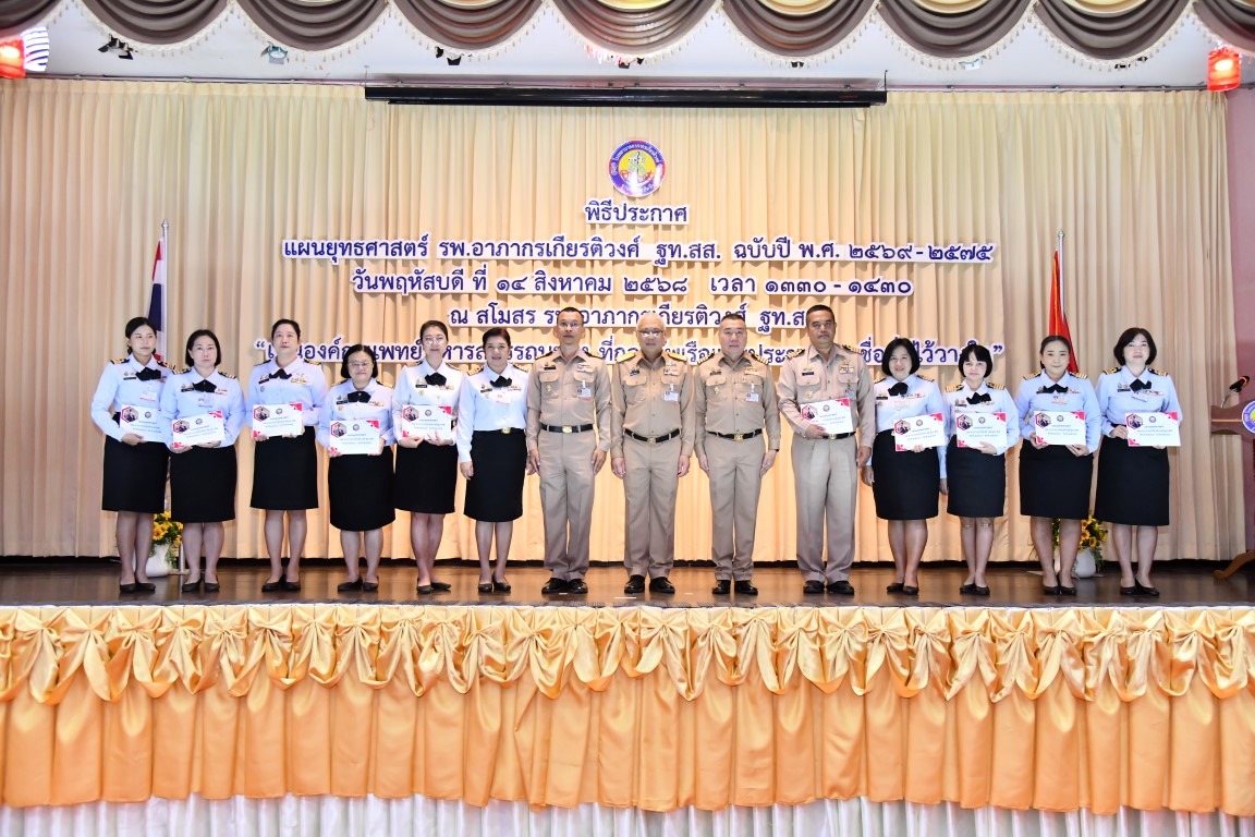 เมื่อ ๑๔ ส.ค.๖๘ พล.ร.ต.ชาตรี เปี่ยมศิริ ผอ.รพ.อาภากรเกียรติวงศ์ ฐท.สส. เป็นประธานในพิธีประกาศแผนยุทธศาสตร์ รพ.อาภากรเกียรติวงศ์ ฐท.สส. ฉบับปี พ.ศ.๒๕๖๙ – ๒๕๗๕ ซึ่งมี คณะผู้บริหาร ข้าราชการ และลูกจ้าง รพ.ฯ ร่วมพิธีฯ ณ ห้องกฤษณจันทร์ กิจการสโมสร รพ.ฯ ข่าวผู้บังคับบัญชา 19 สิงหาคม 2568