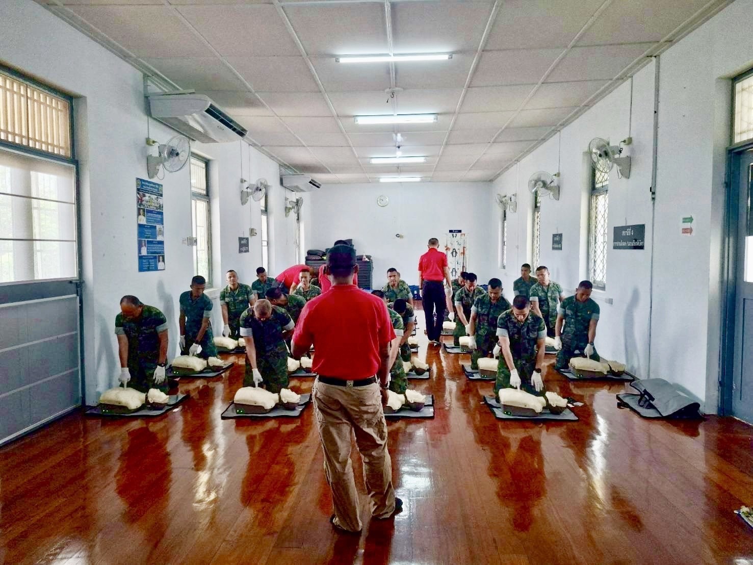 เมื่อ ๒ พ.ค.๖๘ กองนาวิกเวชกิจ รพ.อาภากรเกียรติวงศ์ ฐท.สส. สนับสนุนวิทยากร บรรยายให้ความรู้และฝึกอบรมการปฐมพยาบาลเบื้องต้น การช่วยฟื้นคืนชีพขั้นพื้นฐาน (CPR) และการใช้เครื่องฟื้นคืนคลื่นหัวใจด้วยไฟฟ้าแบบอัตโนมัติ (AED) แก่กำลังพลหลักสูตรเบื้องต้นเฉพาะเหล่าทหารสารวัตร รุ่นปี ๒๕๖๗ ผลัดที่ ๔ กรม สห.ทร. ณ ศูนย์ฝึกอบรมภาวะฉุกเฉินทางการแพทย์ ข่าวผู้บังคับบัญชา 6 พฤษภาคม 2568