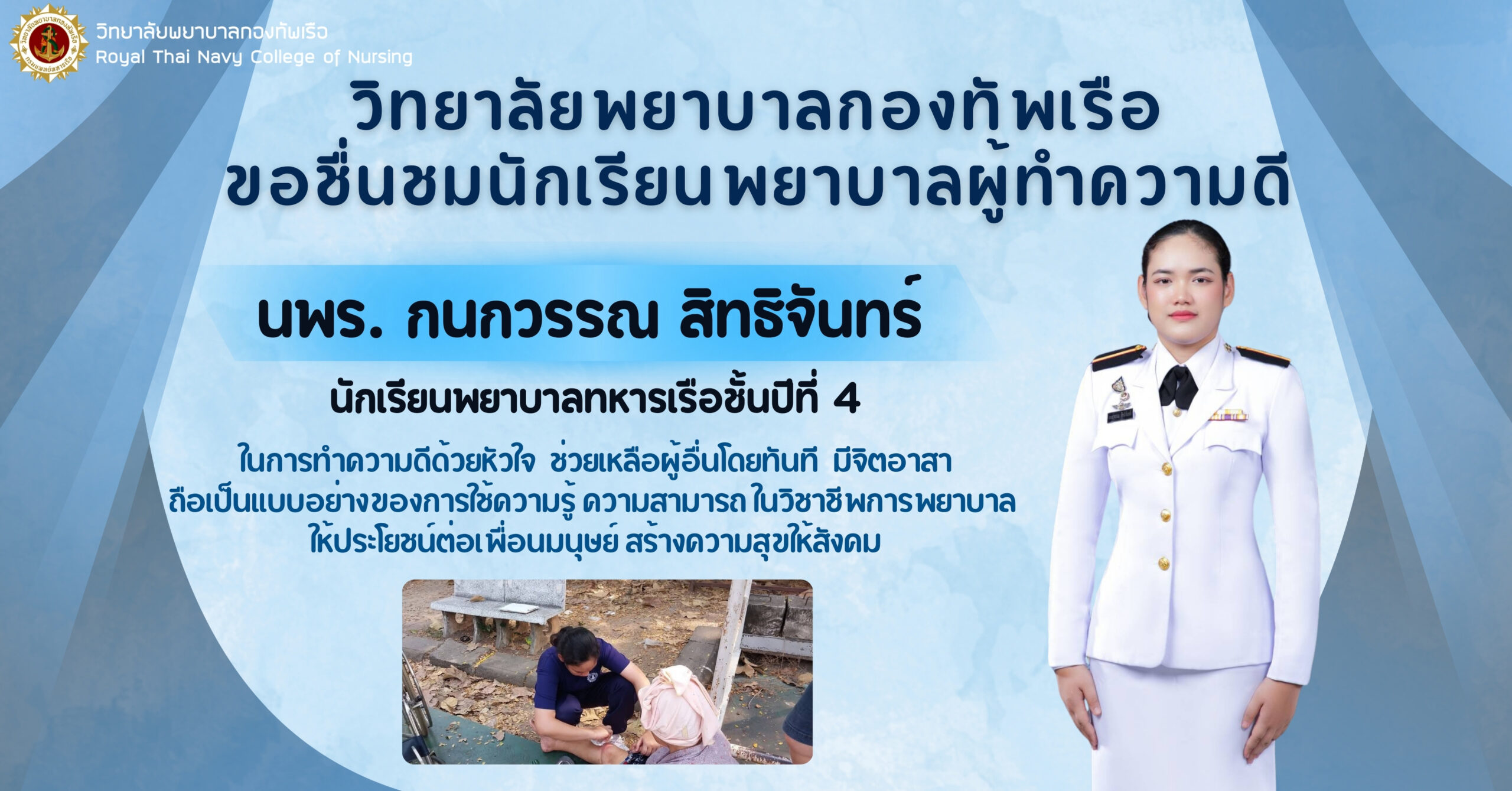 เมื่อ ๓๑ ม.ค.๖๘ วพร.ศวก.พร. ขอชื่นชม การทำความดีของ นักเรียนพยาบาลทหารเรือ กนกวรรณ สิทธิจันทร์ ชั้นปีที่ ๔ เข้าช่วยเหลือผู้สูงอายุที่ล้มบริเวณ สนามบาส ข้างวิทยาลัยพยาบาลกองทัพเรือ โดยใช้ทักษะวิชาชีพการพยาบาล ในการประเมินอาการและให้การปฐมพยาบาลเบื้องต้น ส่งต่อ รพ.สมเด็จพระปิ่นเกล้า พร. ข่าวผู้บังคับบัญชา 6 กุมภาพันธ์ 2568