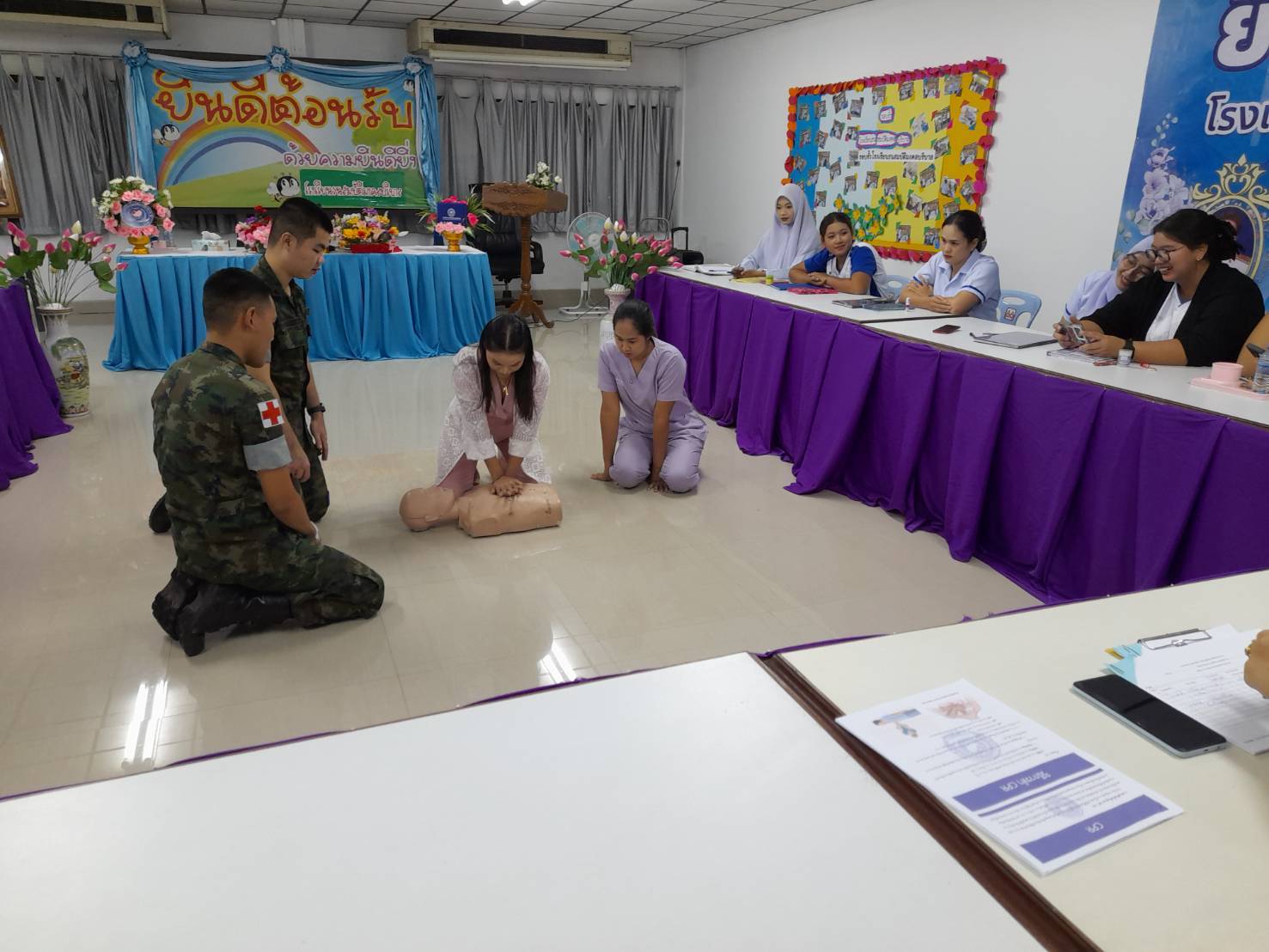 เมื่อ ๘ ธ.ค.๖๗ จ.อ.ศุภกรณ์ ประทุม พยาบาล ฉก.นย.ทร.๓๓ จ.อ.ประกาย สุกใส พยาบาล ฉก.นย.ทร.๓๓ และชป.กร.ร้อย.ปืนเล็กที่ ๔ ฉก.นย.ทร.๓๓ พยาบาลกองร้อย ร่วมกับบุคลากรครู บรรยาย แนะนำและให้ความรู้ในเรื่อง การทำ CPR ให้แก่นักเรียนโรงเรียน ธนสมบัติมงคลบริบาล ณ โรงเรียนธนสมบัติมงคลบริบาล บ.ตันหยงมะลิ ต.สุไหงโก-ลก อ.สุไหงโก-ลก จว.นราธิวาส ข่าวผู้บังคับบัญชา 9 ธันวาคม 2567