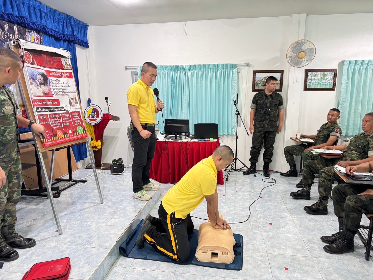 เมื่อ ๙ ธ.ค.๖๗ ร้อย.พ.กอง สนช.กจต. สนับสนุนวิทยากรบรรยายให้ความรู้ การช่วยฟื้นคืนชีพขั้นพื้นฐาน (CPR) และการใช้เครื่องฟื้นคืนคลื่นหัวใจด้วยไฟฟ้าแบบอัตโนมัติ (AED) ให้แก่กำลังพล กอ.รมน.ภาค ๑ ส่วนแยก ๓ ณ อาคารสมาคมแม่บ้าน พัน.ร.๒ กรม.ร.๑ พล.นย. ข่าวผู้บังคับบัญชา 12 ธันวาคม 2567