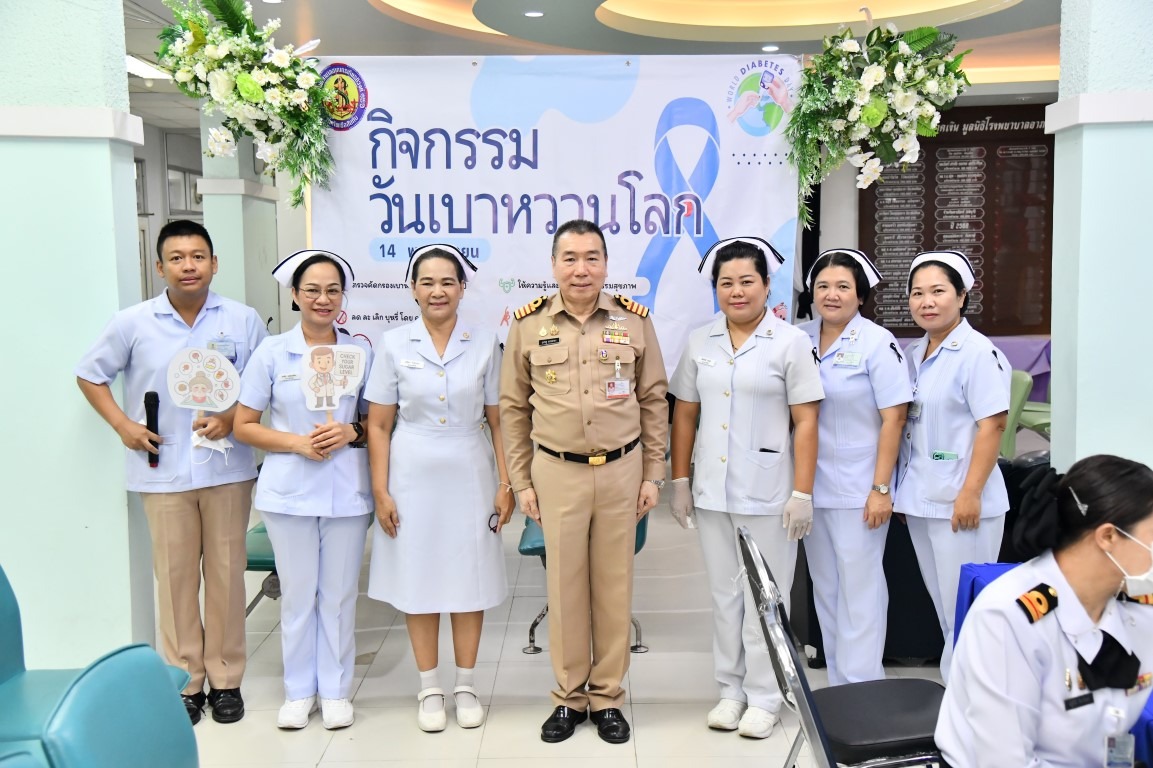 เมื่อ ๑๔ พ.ย.๖๘ พล.ร.ต.กิติศักดิ์ สายนุช ผอ.รพ.สมเด็จพระนางเจ้าสิริกิติ์ พร. เป็นประธานในพิธีเปิดการจัดกิจกรรมวันเบาหวานโลก ประจำปี ๒๕๖๘ จัดโดยกลุ่มงานอายุรเวชกรรม รพ.ฯ ร่วมกับคณะกรรมการโรคเบาหวาน (DM care team) รพ.ฯ ภายใต้แนวคิด “ทำงานสุข ลดทุกความเสี่ยง สุขภาพดี เริ่มที่ทำงาน” ณ อาคารผู้ป่วยนอก รพ.ฯ อ.สัตหีบ จว.ชลบุรี ข่าวผู้บังคับบัญชา 24 พฤศจิกายน 2568