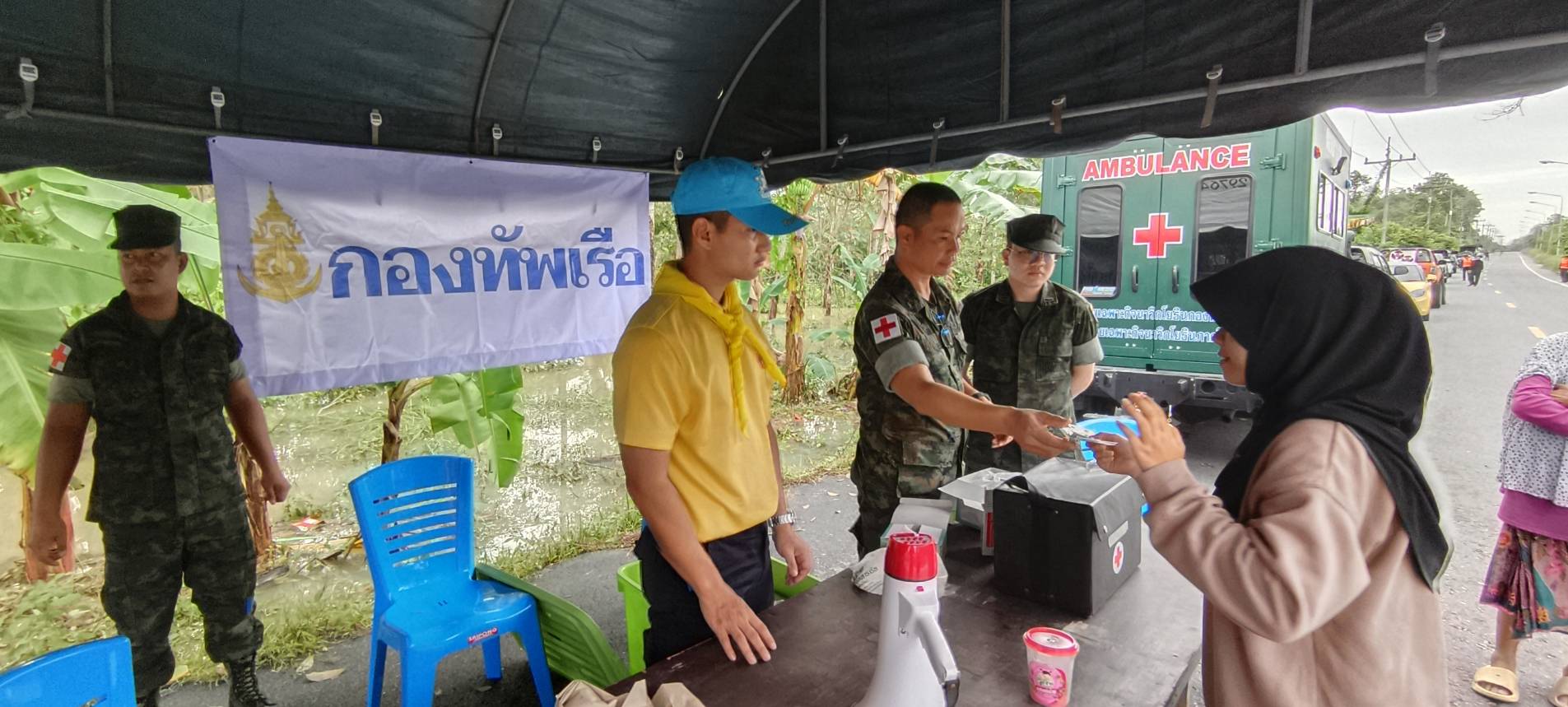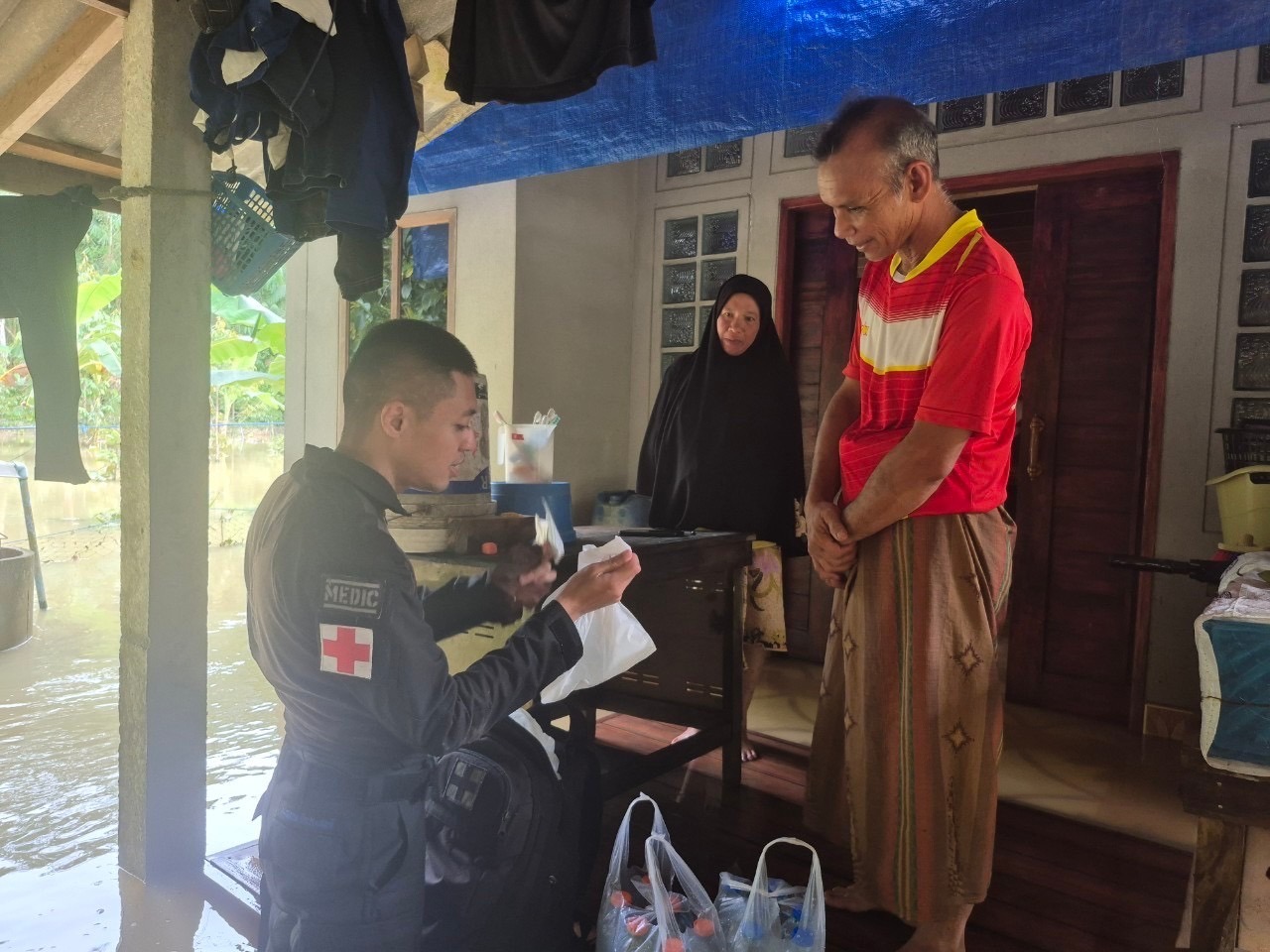 เมื่อ ๑ ธ.ค.๖๗ กองร้อยรักษาความปลอดภัย สนามบิน หน่วยเฉพาะกิจนาวิกโยธิน กองทัพเรือ ชป.กร. พร้อมด้วย พ.จ.อ.ธนศักดิ์ ผ่องแผ้ว จนท.พยาบาลร่วมกับผู้นำชุมชน ดำเนินการตรวจร่างกายและจ่ายยารักษาอาการเบื่องต้น ให้แก่ประชาชนที่ได้รับผลกระทบจากน้ำท่วมขัง ณ ชุมชนบ้านทอน ต.โคกเคียน อ.เมือง จว.นราธิวาส ข่าวผู้บังคับบัญชา 3 ธันวาคม 2567