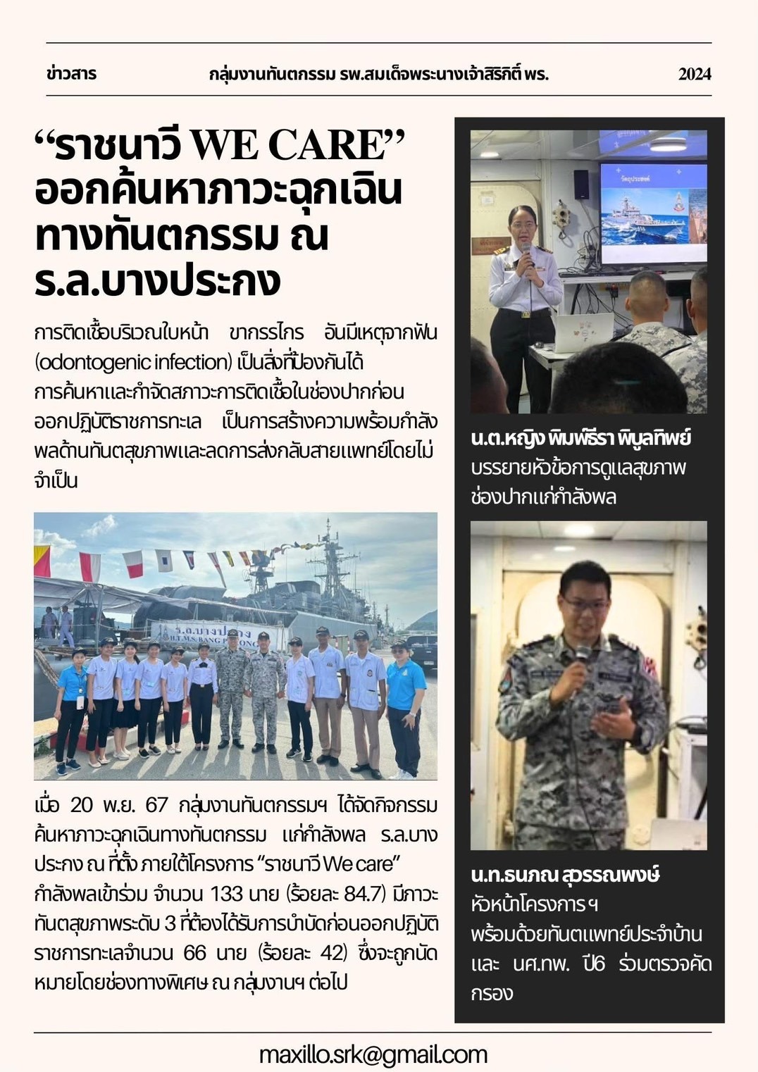 เมื่อ ๒๐ พ.ย.๖๗ กลุ่มงานทันตกรรม รพ.สมเด็จพระนางเจ้าสิริกิติ์ พร. จัดกิจกรรม ค้นหาภาวะฉุกเฉินทางทันตกรรม ให้แก่กำลังพล ร.ล.บางประกง ณ กลุ่มงานทันตกรรม รพ.สมเด็จพระนางเจ้าสิริกิติ์ พร. ข่าวผู้บังคับบัญชา 28 พฤศจิกายน 2567