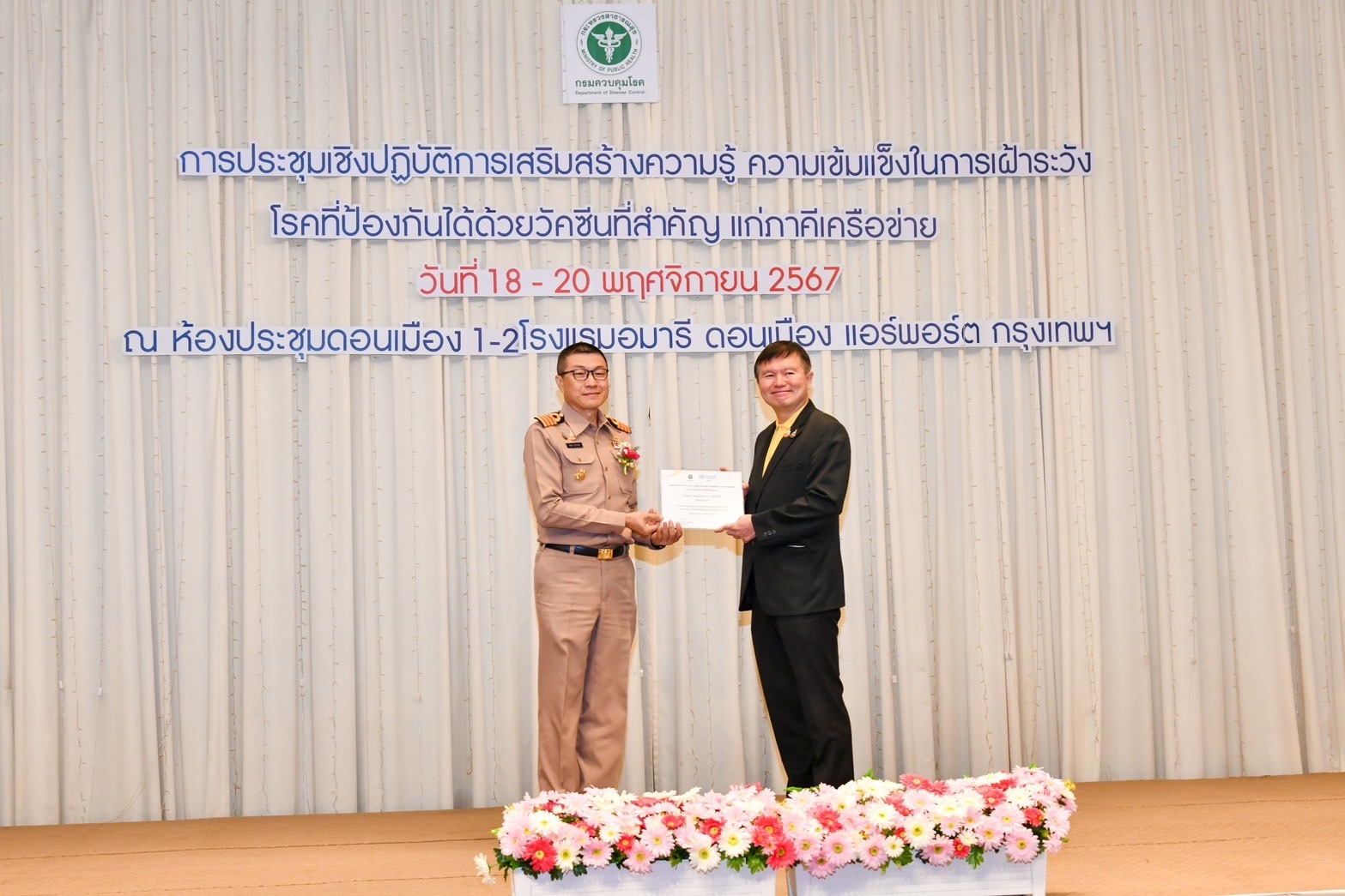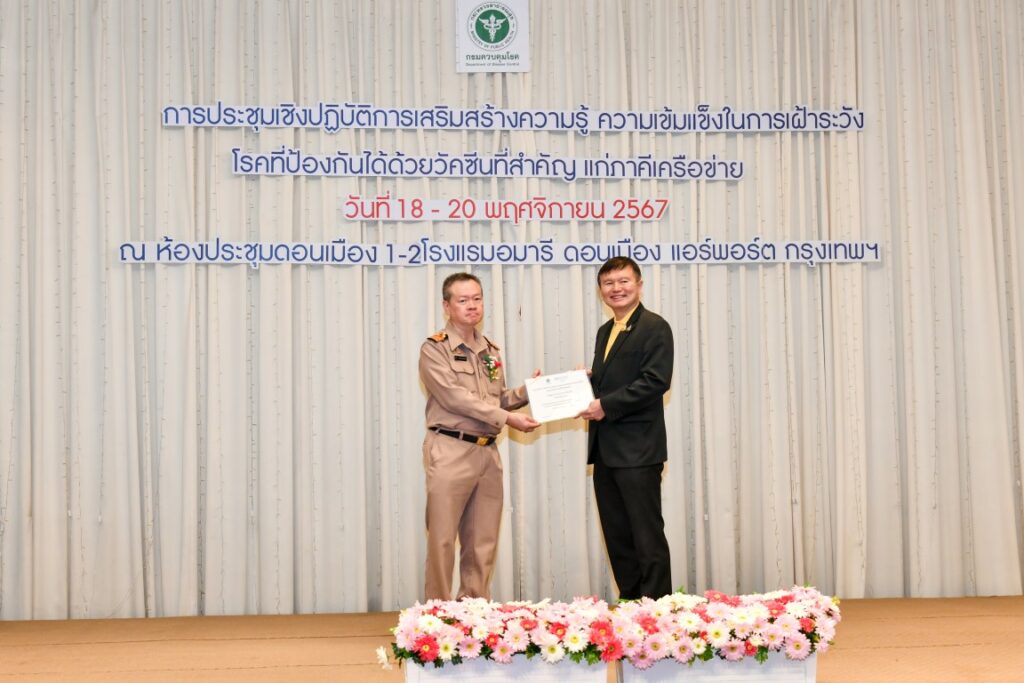 เมื่อ ๑๘ พ.ย.๖๗ น.อ.สุชัย โอฬารรัตน์มณี รอง ผอ.รพ.สมเด็จพระปิ่นเกล้า พร. ฝ่ายบริการสุขภาพ เป็นผู้แทนผู้อำนวยการ รพ.ฯ รับมอบเกียรติบัตร “เครือข่ายสนับสนุนการเฝ้าระวังโรคหัด หัดเยอรมันดีเด่น ประจำปี ๒๕๖๖” ระดับโรงพยาบาลนอกสังกัดกระทรวงสาธารณสุข ในการดำเนินงานกำจัดโรคหัดและหัดเยอรมัน ตามพันธสัญญานานาชาติ จากกรมควบคุมโรค กระทรวงสาธารณสุข และองค์การอนามัยโลก ประจำประเทศไทย ในงานการประชุมเชิงปฏิบัติการเสริมสร้างความรู้ ความเข้มแข็งในการเฝ้าระวังโรคที่ป้องกันได้ด้วยวัคซีนที่สำคัญ แก่ภาคีเครือข่าย โดยมี นพ.ภาณุมาศ ญาณเวทย์สกุล อธิบดีกรมควบคุมโลก เป็นประธานในพิธีมอบฯ ณ ห้องประชุมดอนเมือง ๑ – ๒ โรงแรมอมารี ดอนเมือง แอร์พอร์ต กรุงเทพฯ ข่าวผู้บังคับบัญชา 22 พฤศจิกายน 2567