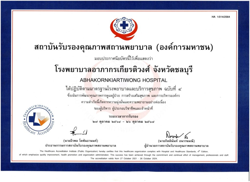 พลเรือตรี ขจิตร์ อุษณีษ์สวัสดิ์ชัย ผู้อำนวยการโรงพยาบาลอาภากรเกียรติวงศ์ ฐานทัพเรือสัตหีบ เข้าพิธีรับมอบประกาศนียรบัตรรับรองคุณภาพสถานพยาบาล Hospital Accreditation (HA) of Thailand รูปแบบเสมือนจริงผ่านสื่ออิเล็กทรอนิกส์ จาก ดร.สาธิต ปิตุเตชะ รัฐมนตรีช่วยว่าการกระทรวงสาธารณสุข เมื่อ ๘ มีนาคม ๒๕๖๕ ซึ่งทางโรงพยาบาลอาภากรเกียรติวงศ์ฐานทัพเรือสัตหีบ ได้ผ่านการรับรองคุณภาพ จากสถาบันรับรองคุณภาพสถานพยาบาล (องค์การมหาชน) เมื่อวันที่ ๒๗ตุลาคม ๒๕๖๔- ๒๖ ตุลาคม ๒๕๖๗