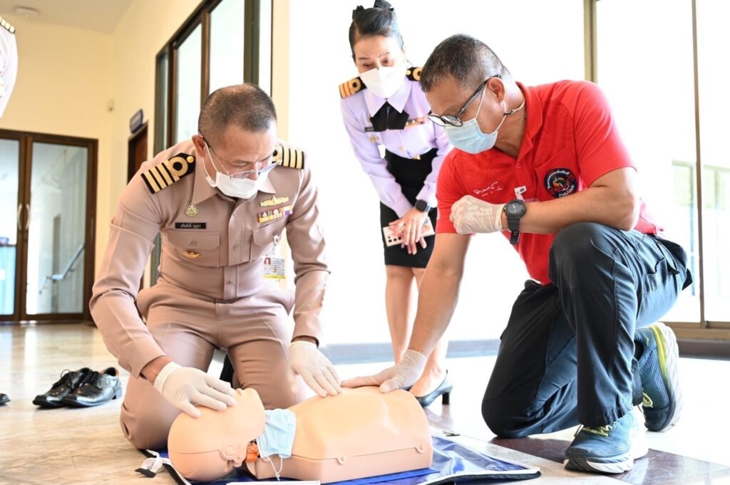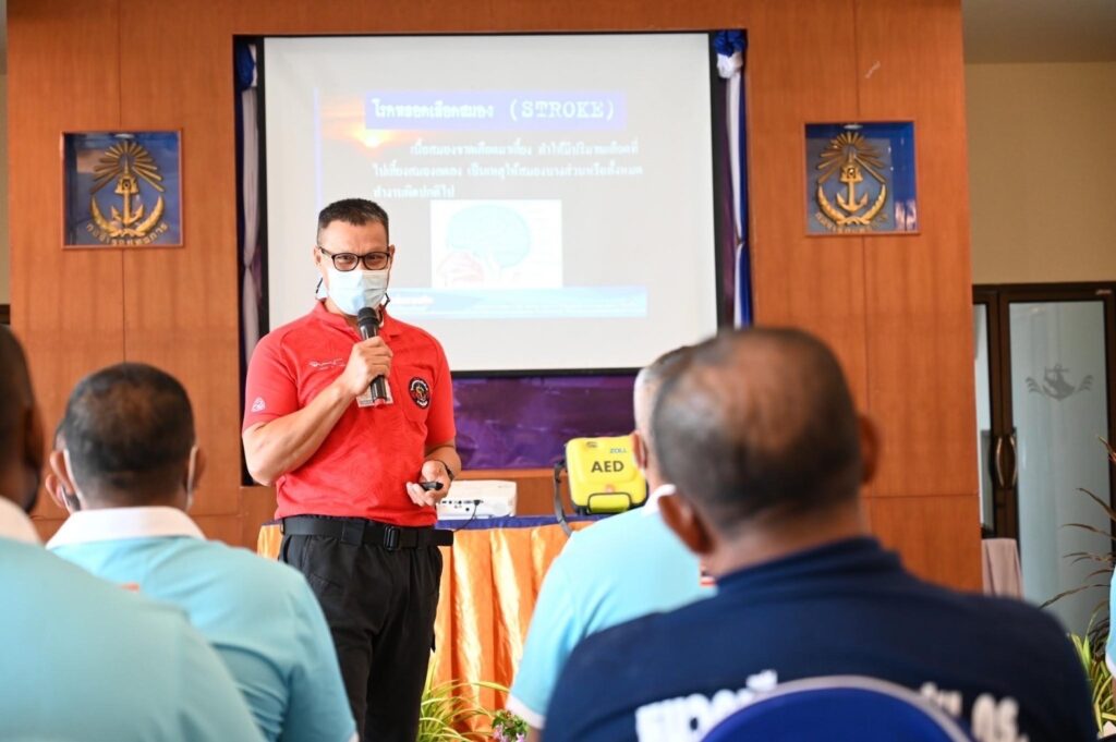 เมื่อ ๗ ก.ย.๖๕ กองนาวิกเวชกิจ โรงพยาบาลอาภากรเกียรติวงศ์ ฐานทัพเรือสัตหีบ สนับสนุนวิทยากร ให้ความรู้ทฤษฏีและฝึกปฏิบัติ ในการช่วยชีวิตขั้นพื้นฐานและการใช้เครื่องกระตุกหัวใจ (AED) แก่กำลังพล กองสนับสนุน กองเรือยุทธการ เพื่อเตรียมความพร้อมด้านองค์ความรู้ และความชำนาญในการช่วยชีวิตขั้นพื้นฐาน เพื่อให้ได้รับการช่วยเหลือที่ถูกต้อง และปลอดภัย ณ สโมสรสัญญาบัตร กองเรือยุทธการ / รพ.อาภากรเกียรติวงศ์ ฐท.สส. / By ข่าวผู้บังคับบัญชา จำนวนคนดู : 9