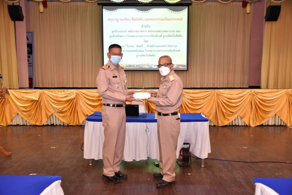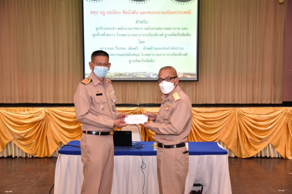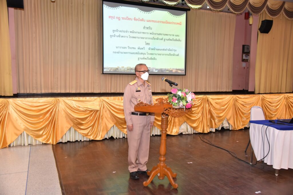 เมื่อ ๑๓ ก.ย.๖๕ พลเรือตรี ขจิตร์ อุษณีย์สวัสดิ์ชัย ผู้อำนวยการโรงพยาบาลอาภากรเกียรติวงศ์ ฐท.สส.เป็นประธานจัดประชุมวิชาการเรื่อง “กฎระเบียบข้อบังคับและขนบธรรมเนียมประเพณีสำหรับลูกจ้างโรงพยาบาล” ซึ่งมุ่งเน้นให้บุคลากรและกลุ่มลูกจ้างที่ปฏิบัติงานในโรงพยาบาล มีความรู้ความเข้าใจเกี่ยวกับกฎระเบียบข้อบังคับระเบียบวินัยรวมถึงการแต่งกายการแสดงความเคารพและขนบธรรมเนียมประเพณีทหารเรือ ซึ่งควรถือเป็นแนวทางการปฏิบัติ โดย นาวาเอก วีระชน พันทวี เป็นวิทยากร ณ ห้องประชุมกฤษณจันทร์ กิจการสโมสร รพ.อาภากรเกียรติวงศ์ ฐท.สส.