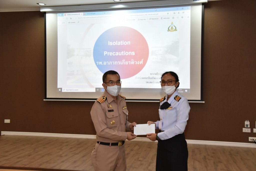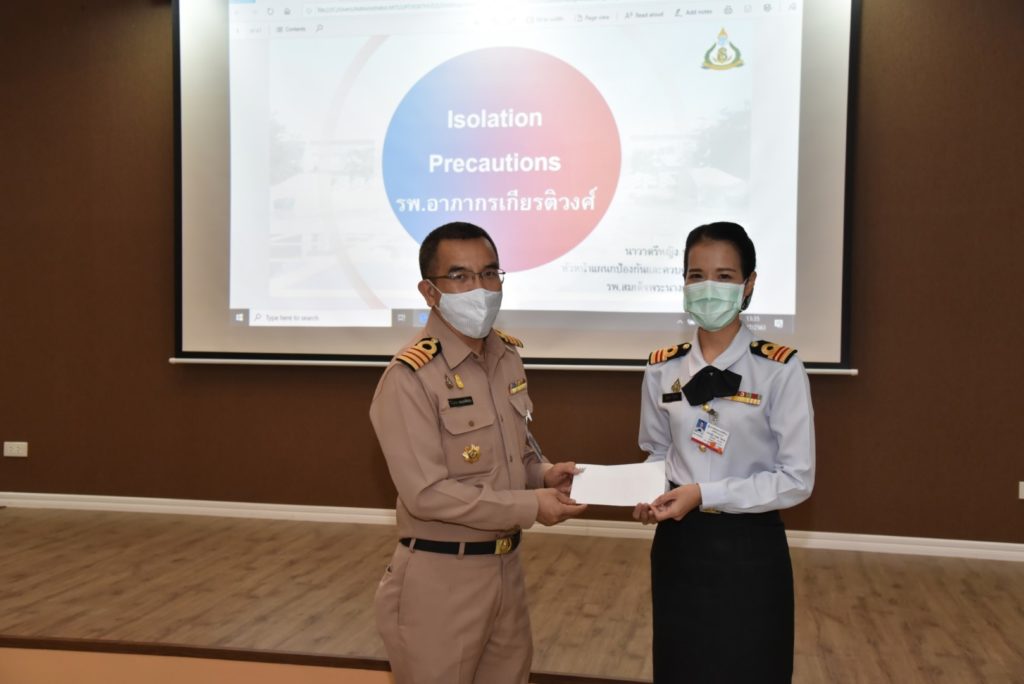 นาวาเอก ชาญชาย สมบูรณ์ศักดิกุล รองผู้อำนวยการ โรงพยาบาลอาภากรเกียรติวงศ์ ฐานทัพเรือสัตหีบ สถานีสัตหีบ เป็นประธานกล่าวเปิดการประชุมวิชาการ เรื่อง “การป้องกันและควบคุมการติดเชื้อในโรงพยาบาล และสถานการณ์ COVID-๑๙” เพื่อเป็นการทบทวนความรู้ ความเข้าใจ นำไปใช้ในการปฏิบัติงานได้อย่างถูกต้อง แก่ ข้าราชการ ลูกจ้าง และบุคลากร ของ รพ. ณ ห้องประชุมลุมพิกานนท์ โรงพยาบาลอาภากรเกียรติวงศ์ ฐานทัพเรือสัตหีบ สถานีสัตหีบ เมื่อวันที่ ๑๖ กรกฎาคม ๒๕๖๓