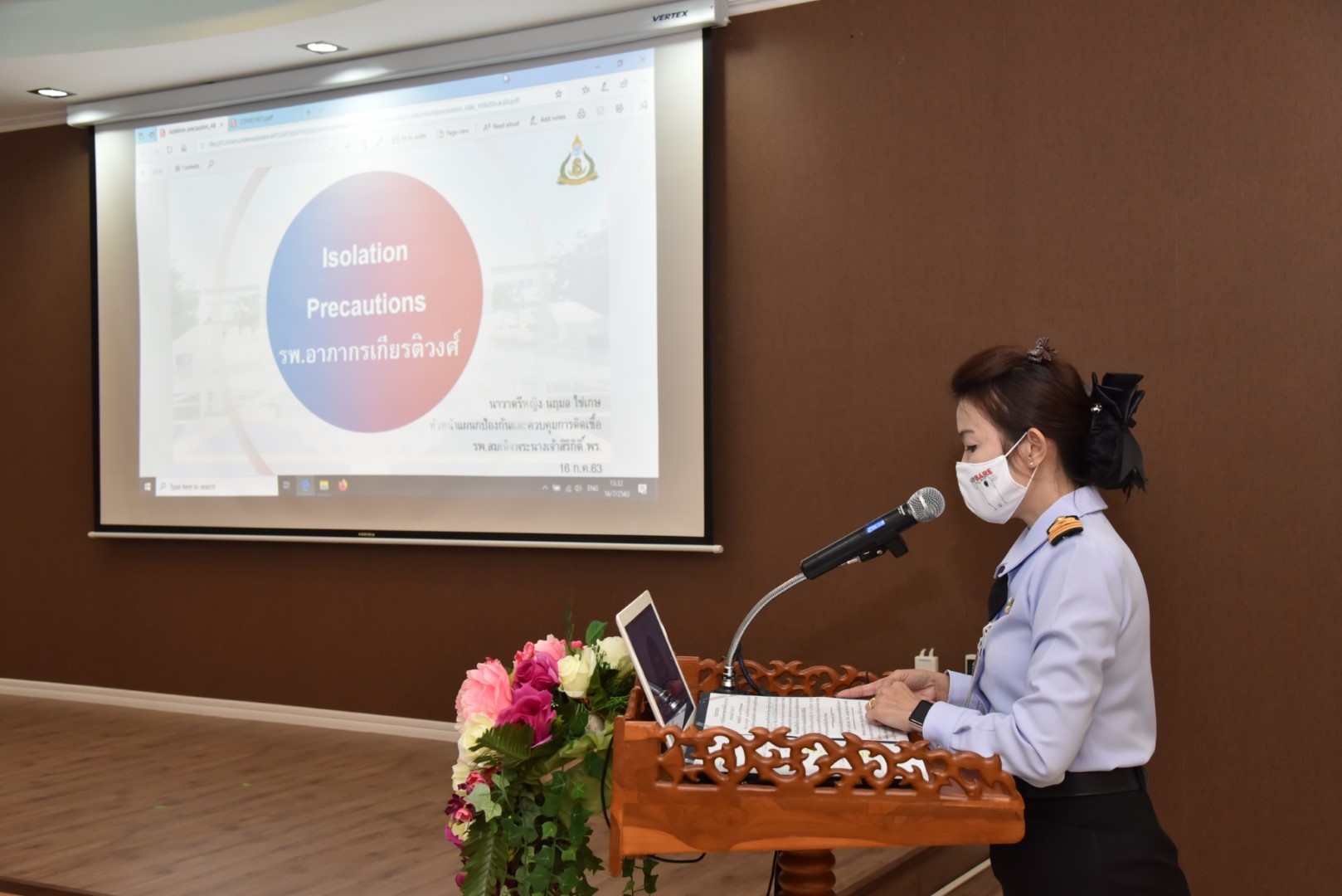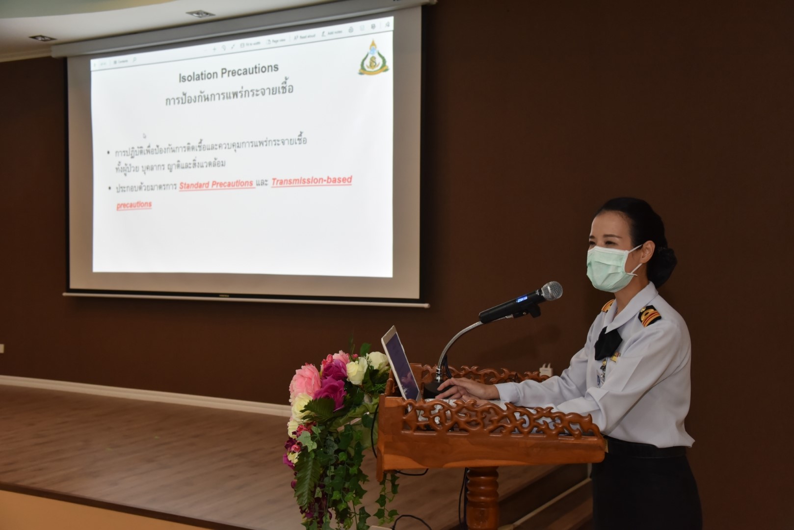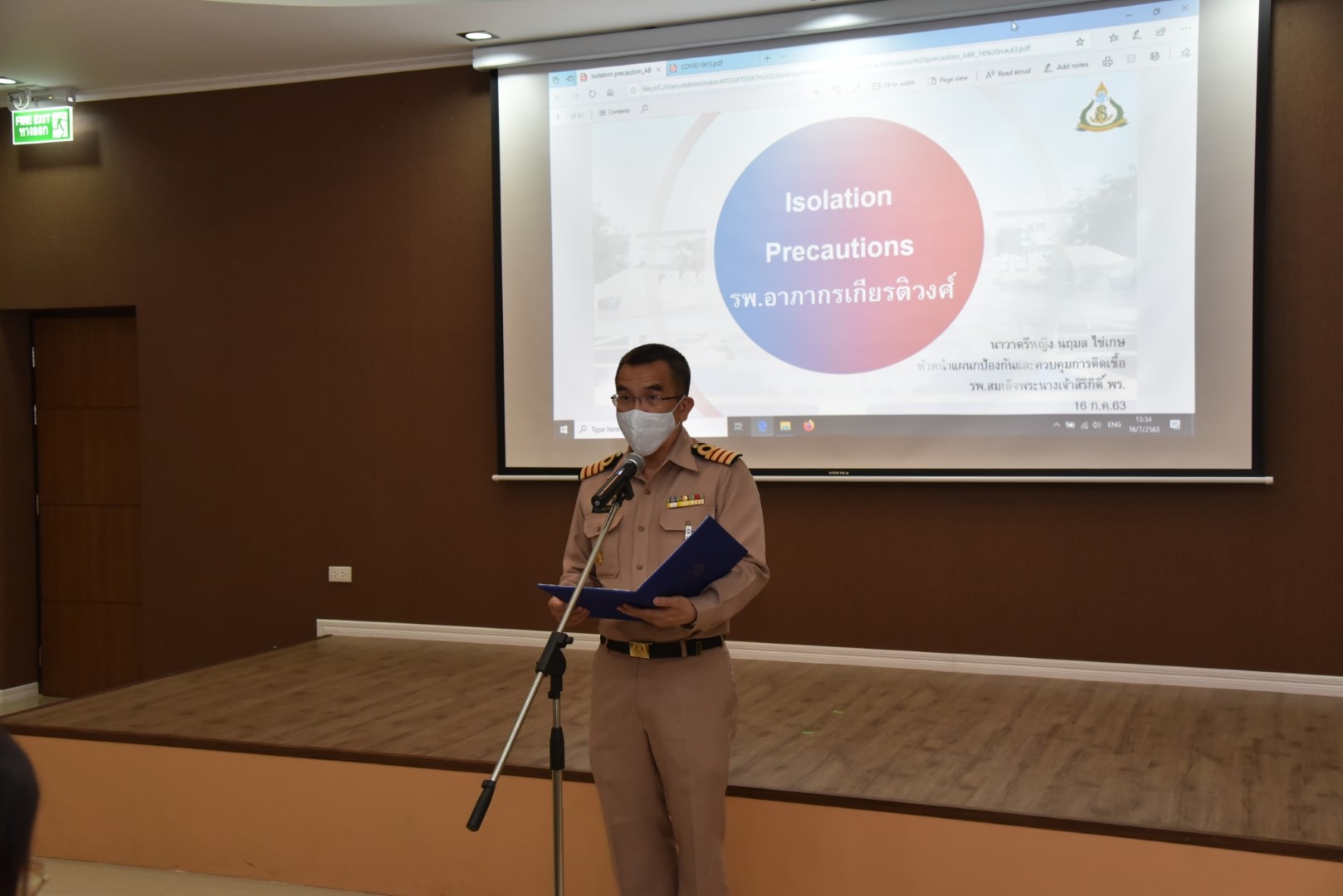 นาวาเอก ชาญชาย สมบูรณ์ศักดิกุล รองผู้อำนวยการ โรงพยาบาลอาภากรเกียรติวงศ์ ฐานทัพเรือสัตหีบ สถานีสัตหีบ เป็นประธานกล่าวเปิดการประชุมวิชาการ เรื่อง “การป้องกันและควบคุมการติดเชื้อในโรงพยาบาล และสถานการณ์ COVID-๑๙” เพื่อเป็นการทบทวนความรู้ ความเข้าใจ นำไปใช้ในการปฏิบัติงานได้อย่างถูกต้อง แก่ ข้าราชการ ลูกจ้าง และบุคลากร ของ รพ. ณ ห้องประชุมลุมพิกานนท์ โรงพยาบาลอาภากรเกียรติวงศ์ ฐานทัพเรือสัตหีบ สถานีสัตหีบ เมื่อวันที่ ๑๖ กรกฎาคม ๒๕๖๓