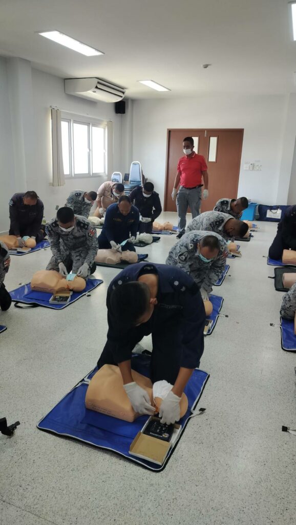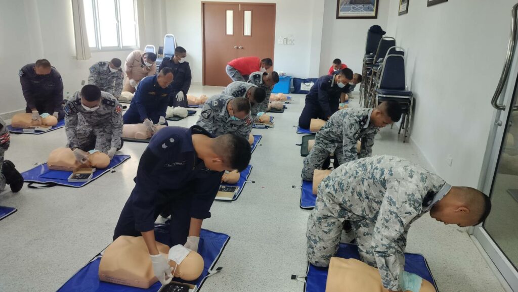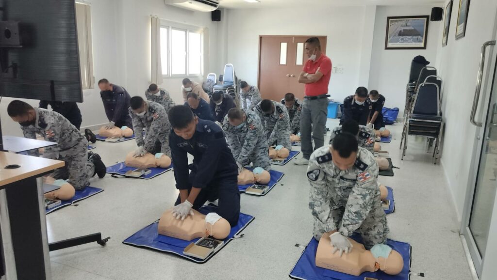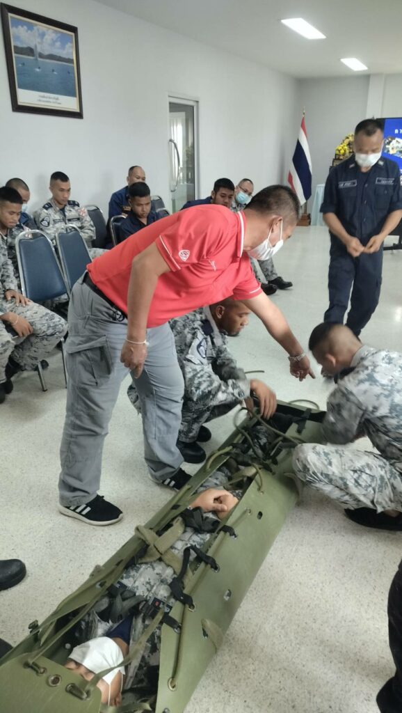 เมื่อ ๘ พ.ค.๖๖ กองนาวิกเวชกิจ รพ.อาภากรเกียรติวงศ์ ฐท.สส. สนับสนุนวิทยากรให้ความรู้ทฤษฏีและปฏิบัติ ในการปฐมพยาบาล การช่วยชีวิตขั้นพื้นฐานและการใช้เครื่อง AEDและการเคลื่อนย้ายผู้ป่วยในเรือ ให้แก่ กำลังพล กยพ.กร ณ ร้อย.บก.กยพ.กร
