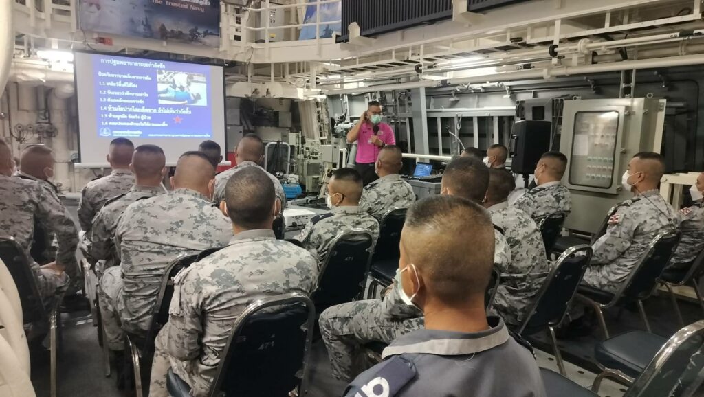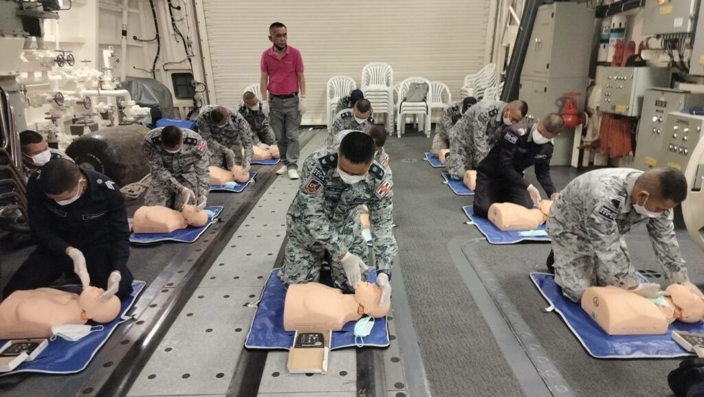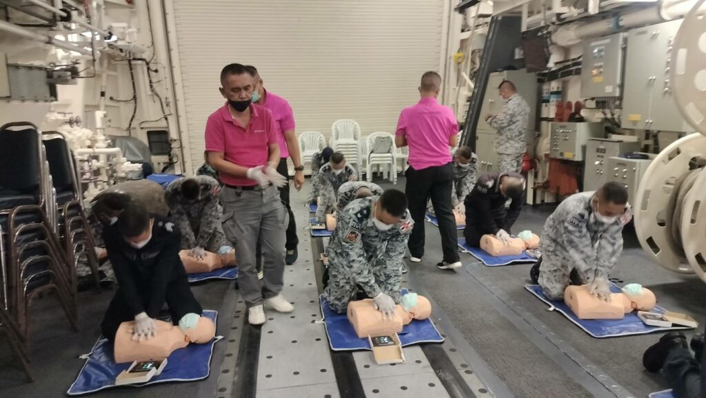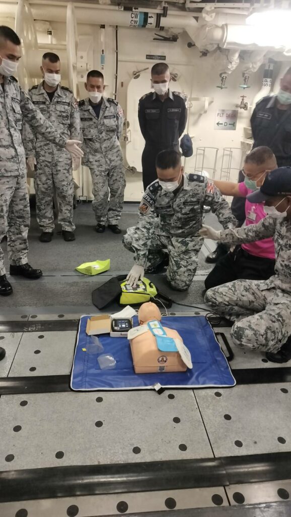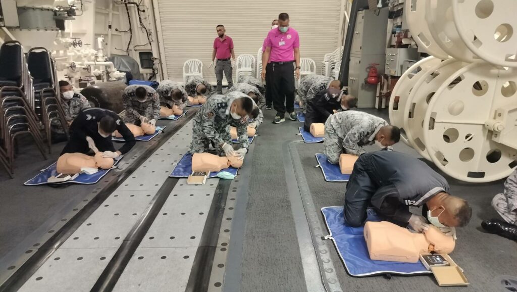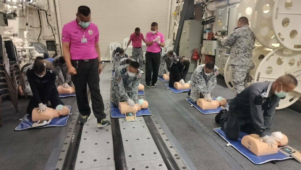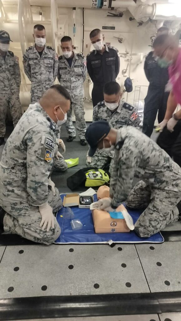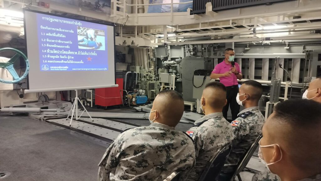 เมื่อ ๙ พ.ค.๖๖ กองนาวิกเวชกิจ รพ.อาภากรเกียรติวงศ์ ฐท.สส. สนับสนุนวิทยากรให้ความรู้ทฤษฏีและปฏิบัติ ในการปฐมพยาบาล การช่วยชีวิตขั้นพื้นฐานและการใช้เครื่อง AED ให้แก่ กำลังพล ร.ล.ภูมิพลอดุลยเดช ณ ห้องเก็บเฮลิคอปเตอร์ ร.ล.ภูมิพลอดุลยเดช / รพ.อาภากรเกียรติวงศ์ ฐท.สส. / By ข่าวผู้บังคับบัญชา – จำนวนคนดู : 13