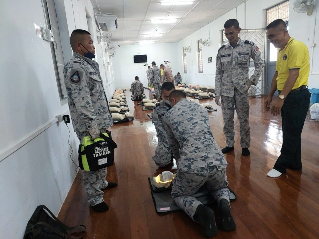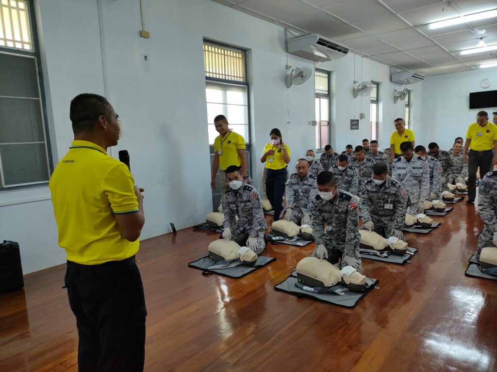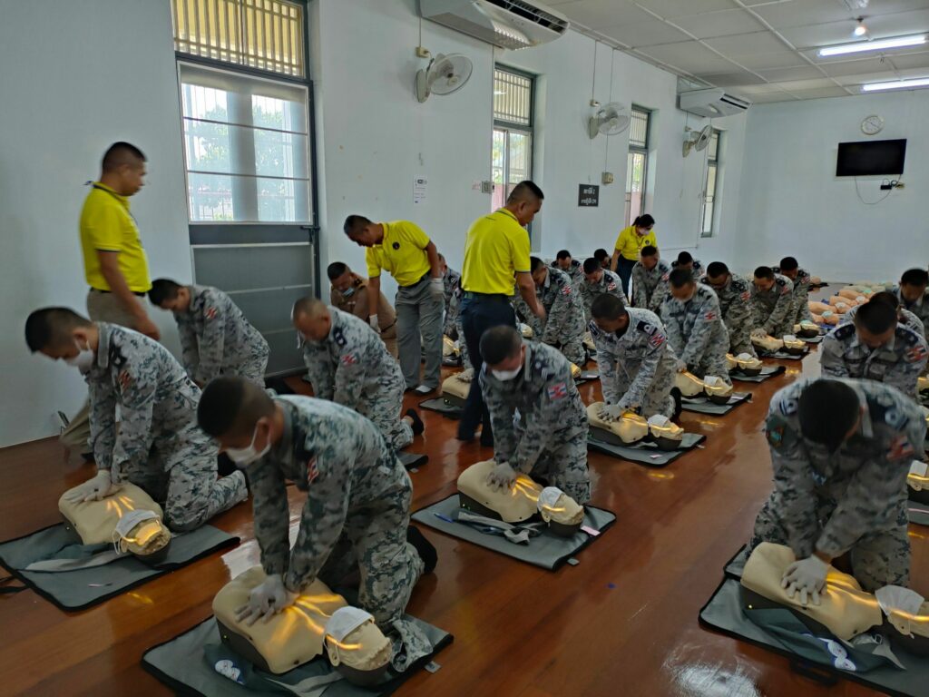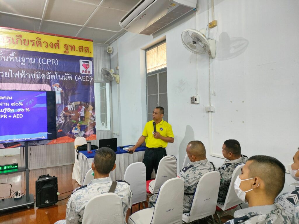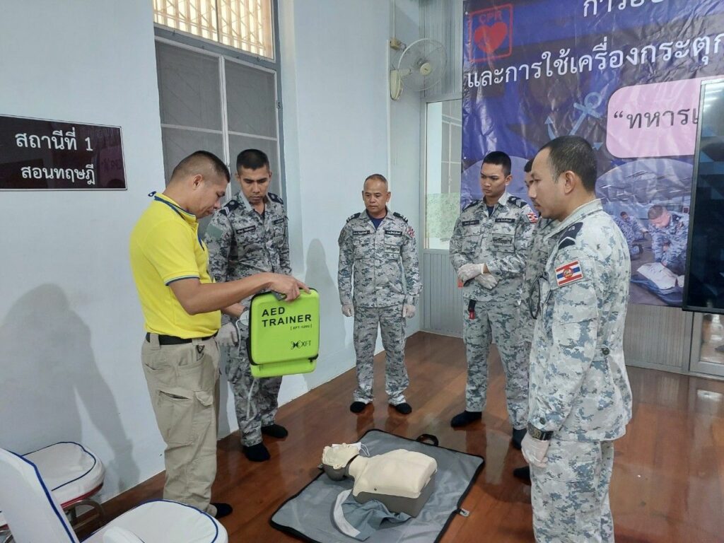 เมื่อ ๑ พ.ย.๖๖ กองนาวิกเวชกิจ รพ.อาภากรเกียรติวงศ์ ฐท.สส. สนับสนุนวิทยากรให้ความรู้ทฤษฏีและปฏิบัติ ในการปฐมพยาบาล การช่วยชีวิตขั้นพื้นฐานและการใช้เครื่องฟื้นคืนคลื่นหัวใจไฟฟ้าแบบอัตโนมัติ (AED) ให้แก่ กำลังพล ร.ล.รัตนโกสินทร์ กฟก.๑ กร. ณ ห้องอบรมโครงการพัฒนาทักษะการกู้ชีพ รพ.อาภากรเกียรติวงศ์ ฐท.สส. / รพ.อาภากรเกียรติวงศ์ ฐท.สส. / By ข่าวผู้บังคับบัญชา จำนวนคนดู : 6