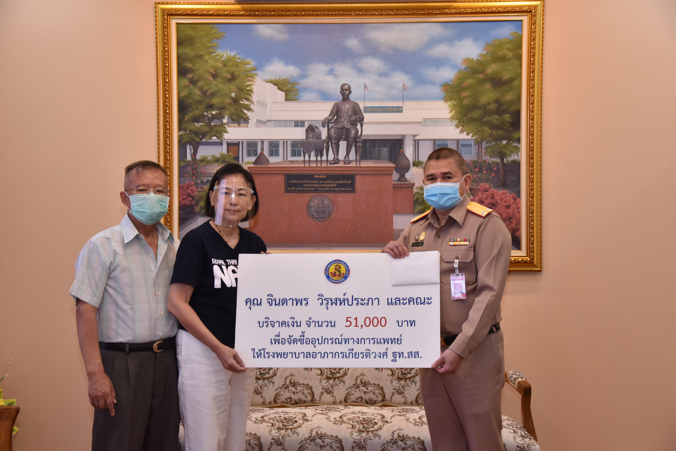 ๒๕ ส.ค. ๖๓ พล.ร.ต.ชลธร สุวรรณกิตติ ผอ.รพ.อาภากรเกียรติวงศ์ ฐท.สส. รับมอบเงินบริจาค จำนวน ๕๑,๐๐๐ บาท เพื่อจัดซื้ออุปกรณ์ทางการแพทย์ ให้กับ รพ.ฯ จาก คุณ จินดาพร วิรุฬห์ประภา และคณะ