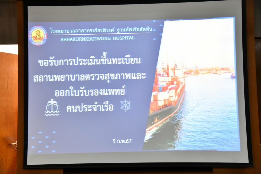 เมื่อ ๕ ก.พ.๖๗ น.อ.ชาตรี เปี่ยมศิริ รอง ผอ.รพ.อาภากรเกียรติวงศ์ ฐท.สส. ให้การต้อนรับคณะผู้ตรวจประเมิน นำโดย นพ.เปรม เปี่ยมนิธิกุล และคณะ ฯ จากโรงพยาบาลนพรัตนราชธานี เพื่อทาง รพ.อาภากรเกียรติวงศ์ ฐท.สส. จะขอ รับการตรวจประเมินเพื่อ ขึ้นทะเบียนสถานพยาบาลที่ออกใบรับรองแพทย์คนประจำเรือ ตามพระราชบัญญัติแรงงานทางทะเล พ.ศ.๒๕๕๘ ณ ห้องประชุมอาภากรเกียรติวงศ์ รพ.อาภากรเกียรติวงศ์ ฐท.สส. / รพ.อาภากรเกียรติวงศ์ ฐท.สส. / By ข่าวผู้บังคับบัญชา จำนวนคนดู : 8