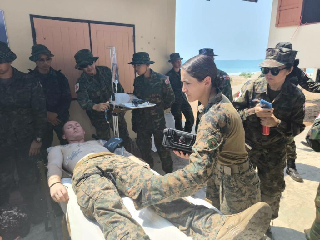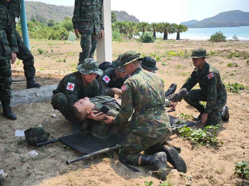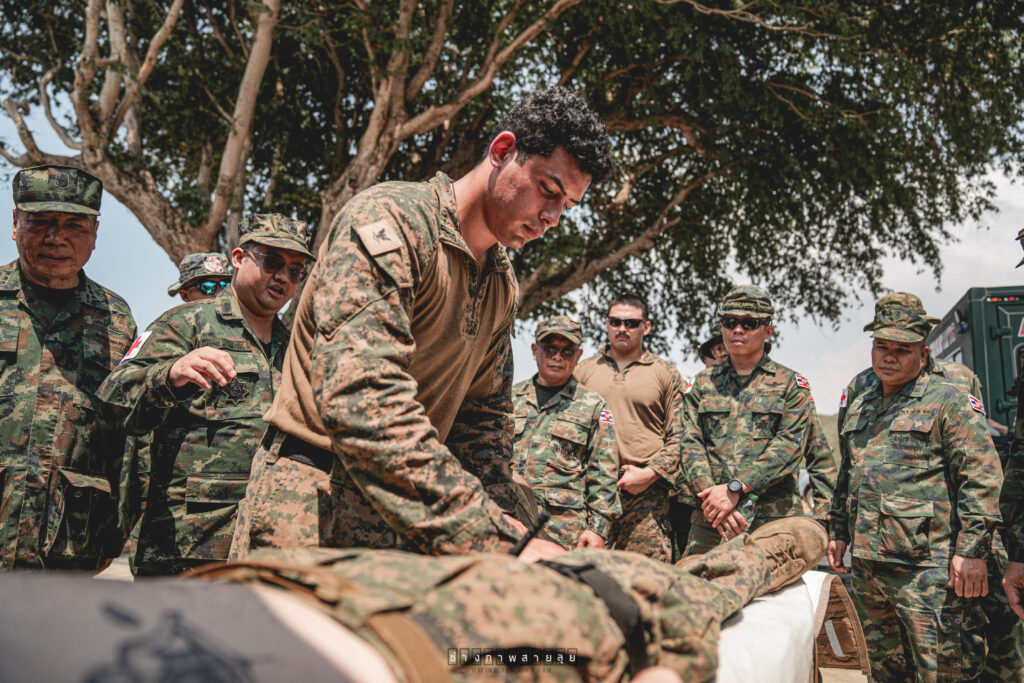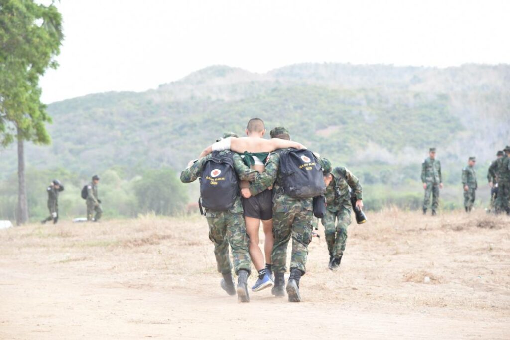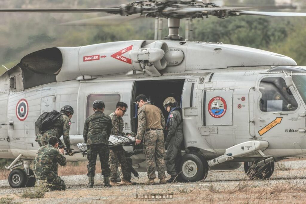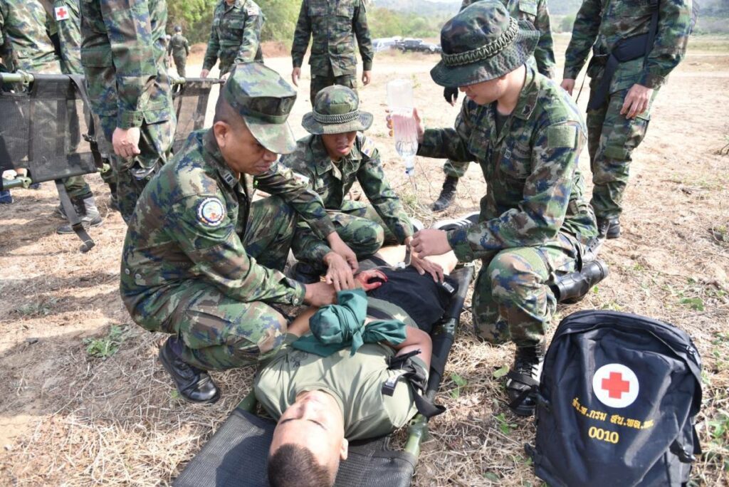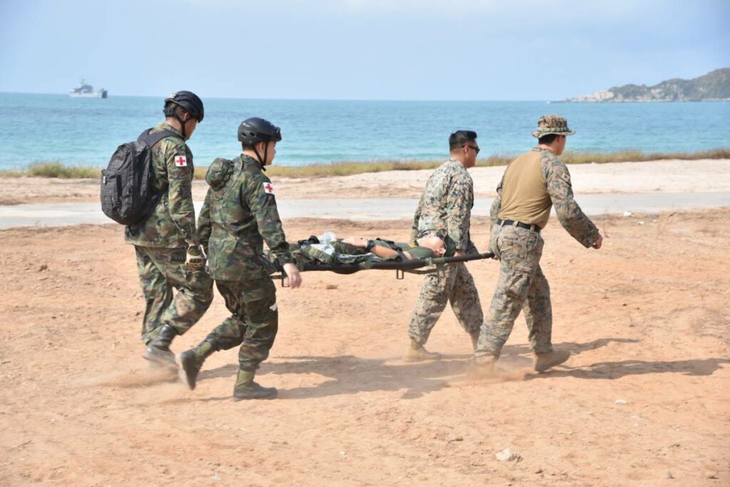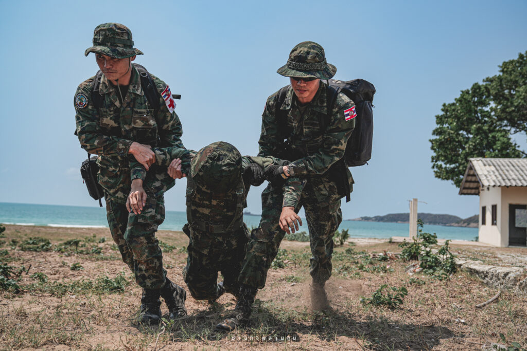 ระหว่าง ๒๙ ก.พ. – ๑ มี.ค.๖๗ มี น.อ.สุเชษฐ ตรรกธาดา รอง ผอ.รพ.อาภากรเกียรติวงศ์ ฐท.สส. และ ผู้อำนวยการฝึกด้านการแพทย์ COBRA GOLD 2024 นำกำลังพล รพ.ฯ ร่วมกับ พัน.พ.กรม สน.พล.นย. และ พัน.พ.กรม สน.สอ.รฝ. ดำเนินการฝึกช่วยชีวิตเชิงยุทธวิธี TCCC และการเคลื่อนย้ายผู้ป่วยเจ็บ การฝึกสมมุติสถานการณ์ร่วมกับเจ้าหน้าที่สายแพทย์ กองทัพเรือสหรัฐอเมริกาเพื่อเป็นการแลกเปลี่ยนเรียนรู้การปฏิบัติในการช่วยชีวิตเชิงยุทธวิธี TCCC และการเคลื่อนย้ายผู้บาดเจ็บ รวมถึงการส่งกลับสายแพทย์ในการยกพลขึ้นบก ณ สนามฝึก ทร. ๑๕ หาดยาว / รพ.อาภากรเกียรติวงศ์ ฐท.สส. / By ข่าวผู้บังคับบัญชา จำนวนคนดู : 5