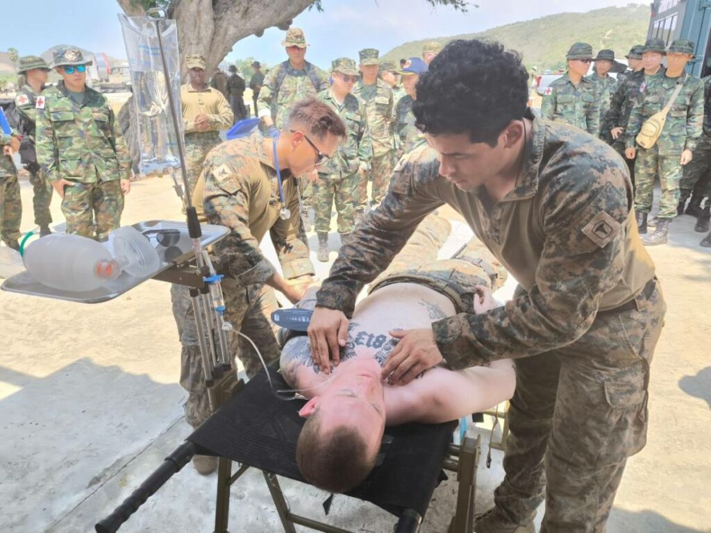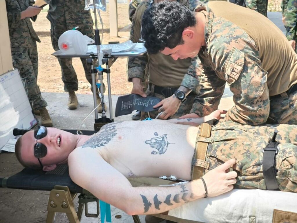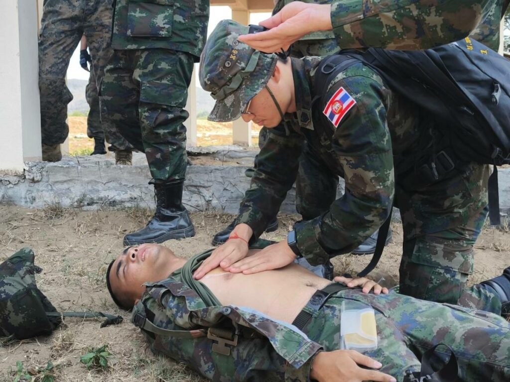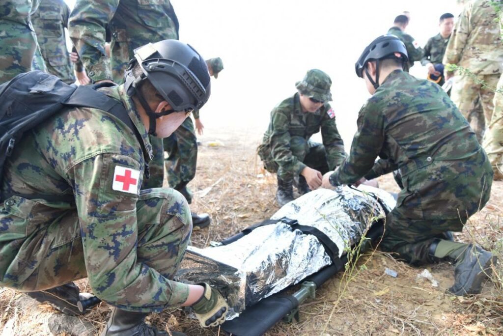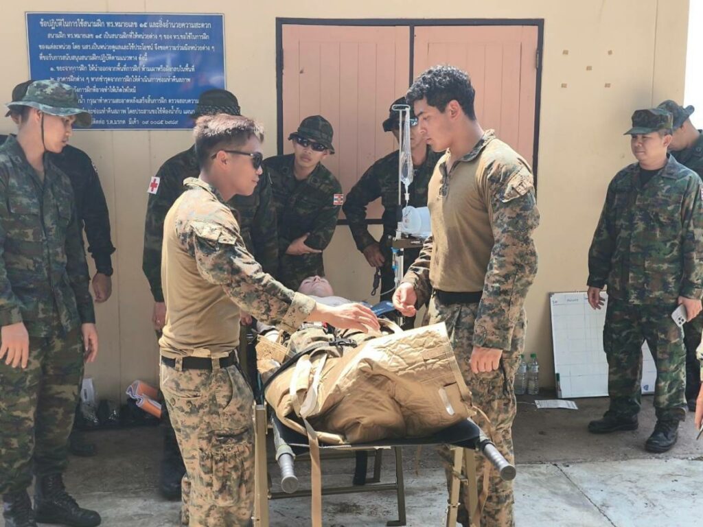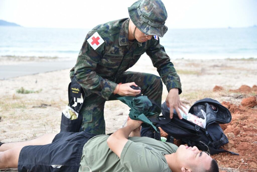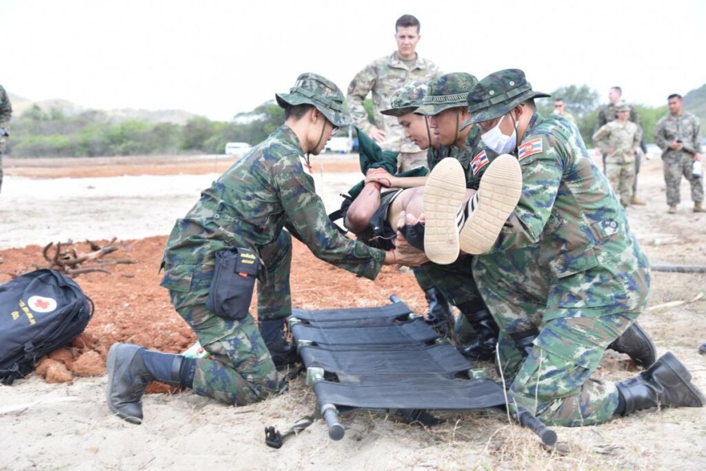 ระหว่าง ๒๙ ก.พ. – ๑ มี.ค.๖๗ มี น.อ.สุเชษฐ ตรรกธาดา รอง ผอ.รพ.อาภากรเกียรติวงศ์ ฐท.สส. และ ผู้อำนวยการฝึกด้านการแพทย์ COBRA GOLD 2024 นำกำลังพล รพ.ฯ ร่วมกับ พัน.พ.กรม สน.พล.นย. และ พัน.พ.กรม สน.สอ.รฝ. ดำเนินการฝึกช่วยชีวิตเชิงยุทธวิธี TCCC และการเคลื่อนย้ายผู้ป่วยเจ็บ การฝึกสมมุติสถานการณ์ร่วมกับเจ้าหน้าที่สายแพทย์ กองทัพเรือสหรัฐอเมริกาเพื่อเป็นการแลกเปลี่ยนเรียนรู้การปฏิบัติในการช่วยชีวิตเชิงยุทธวิธี TCCC และการเคลื่อนย้ายผู้บาดเจ็บ รวมถึงการส่งกลับสายแพทย์ในการยกพลขึ้นบก ณ สนามฝึก ทร. ๑๕ หาดยาว / รพ.อาภากรเกียรติวงศ์ ฐท.สส. / By ข่าวผู้บังคับบัญชา จำนวนคนดู : 5