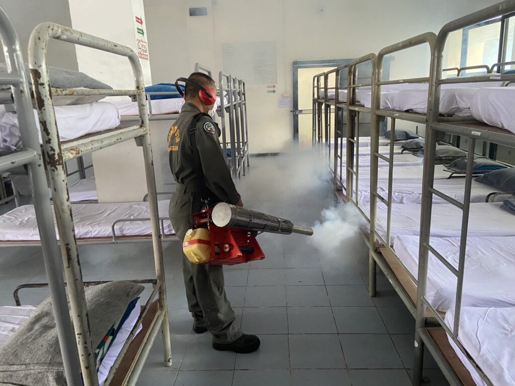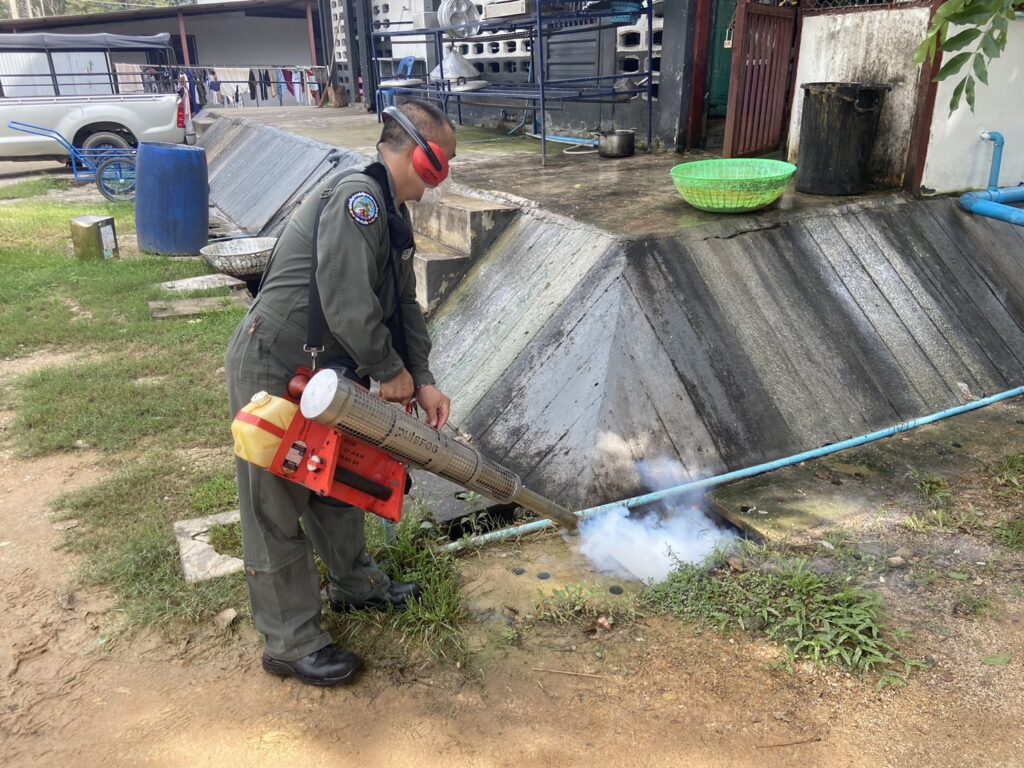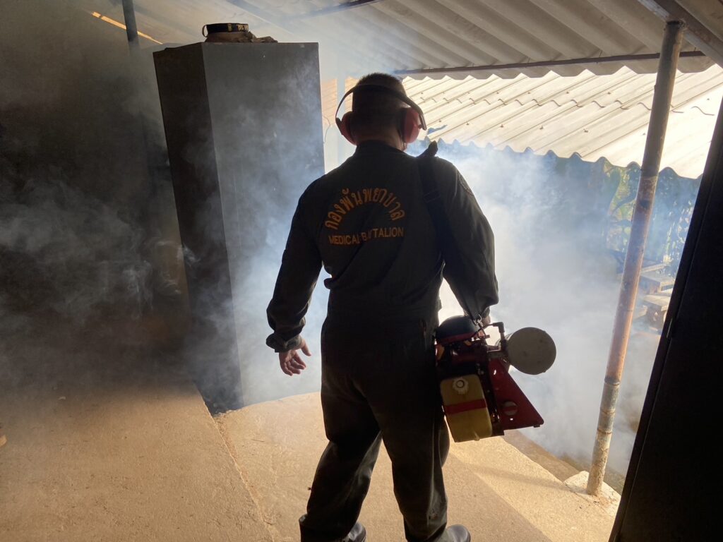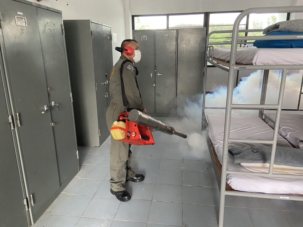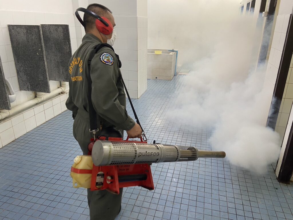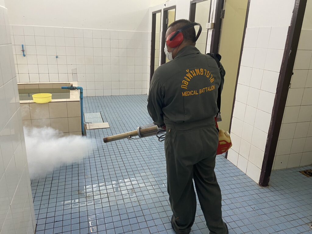 เมื่อ ๙ พ.ย.๖๖ กองเวชกรรมป้องกัน พัน.พ.กรม สน.สอ.รฝ พ่นหมอกควันกำจัดยุง ให้แก่ ร้อย.บก.สอ.รฝ., รปภ.ประตูใหญ่ และสโมสรไม้ดอกไม้ประดับ