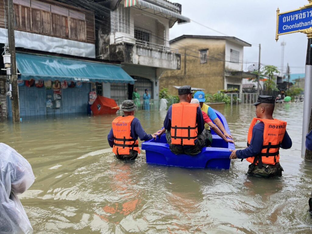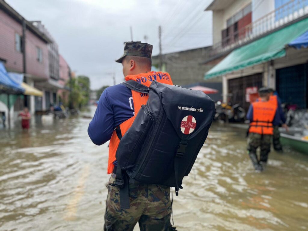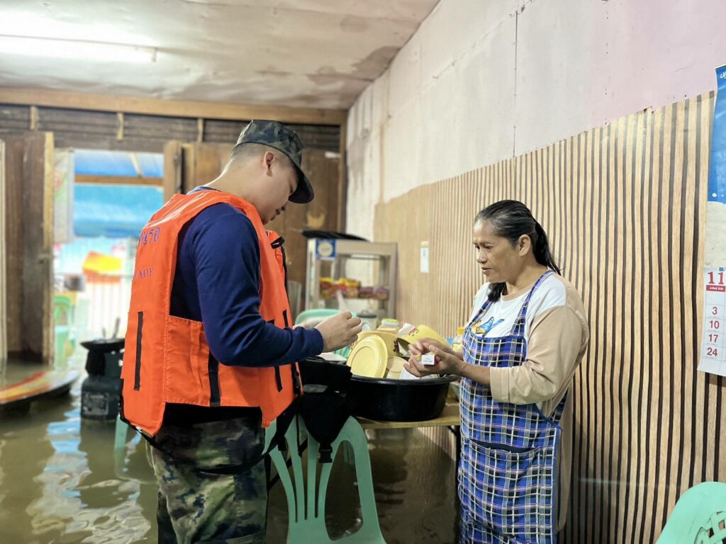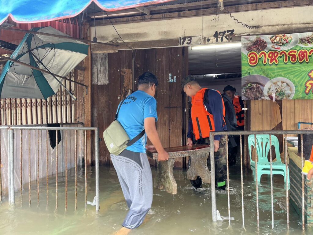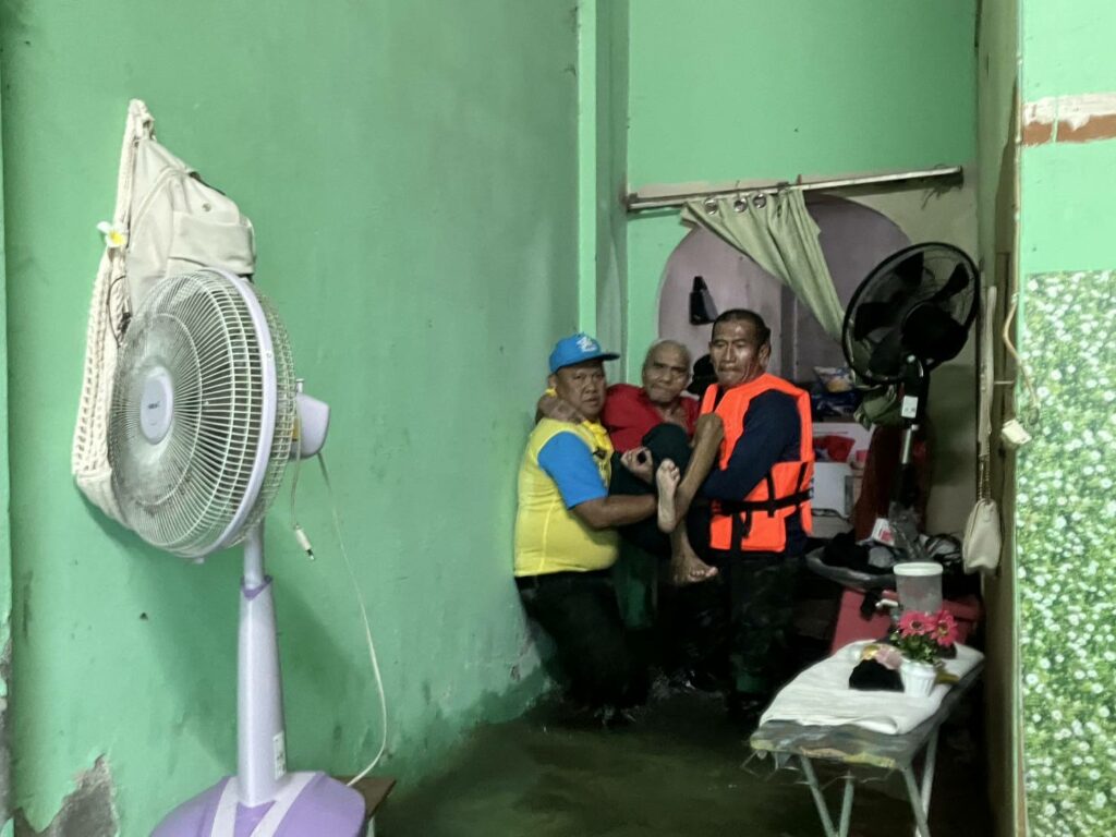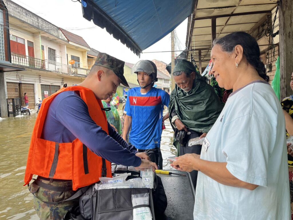 เมื่อ ๒๘ พ.ย.๖๗ น.ท.อำนาจ คงแสง ผบ.ฉก.นย.ทร.๓๓ พร้อมด้วย ว่าที่ น.ต.ศักดิ์นรา ใจสุวรรณนกร.ฉก.นย.ทร.๓๓ และ จนท.พยาบาล ลงพื้นที่ที่ได้รับผลกระทบจากปัญหาน้ำท่วมฉับพลัน และได้ทำการช่วยเหลือประชาชนในพื้นที่ ช่วยขนย้ายสิ่งของ เคลื่อนย้ายผู้ป่วยติดเตียง และประชาชนในพื้นที่ ออกจากพื้นที่เสี่ยงที่คาดว่าระดับน้ำจะสูงขึ้น พร้อมทั้งแจกจ่ายยาสามัญเบื้องต้น ณ ชุมชนท่าโรงเลื่อย เขตเทศบาลเมืองสุไหงโก – ลก อ.สุไหงโก – ลก จว.นราธิวาส / พัน.พ.กรม สน.พล.นย. / By ข่าวผู้บังคับบัญชา จำนวนคนดู : 4