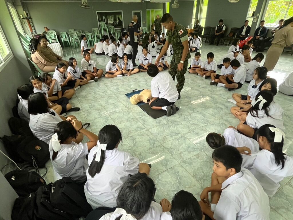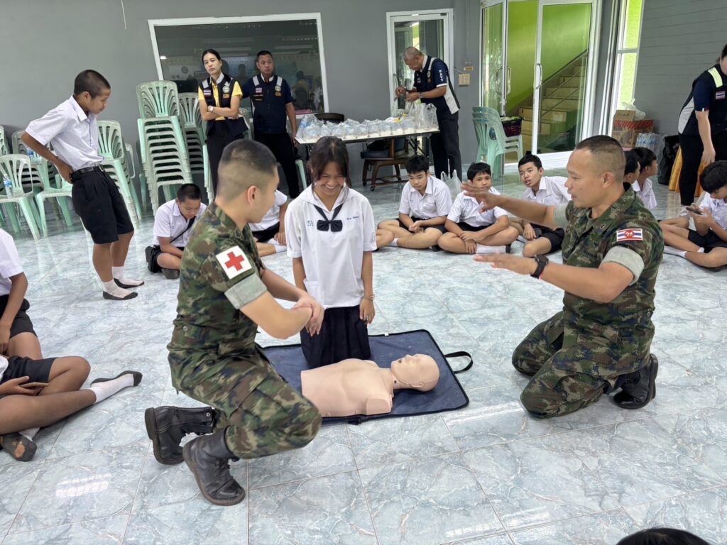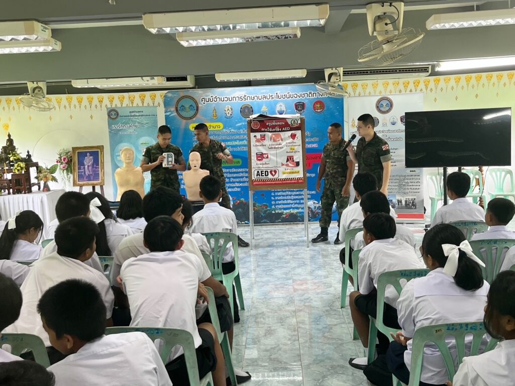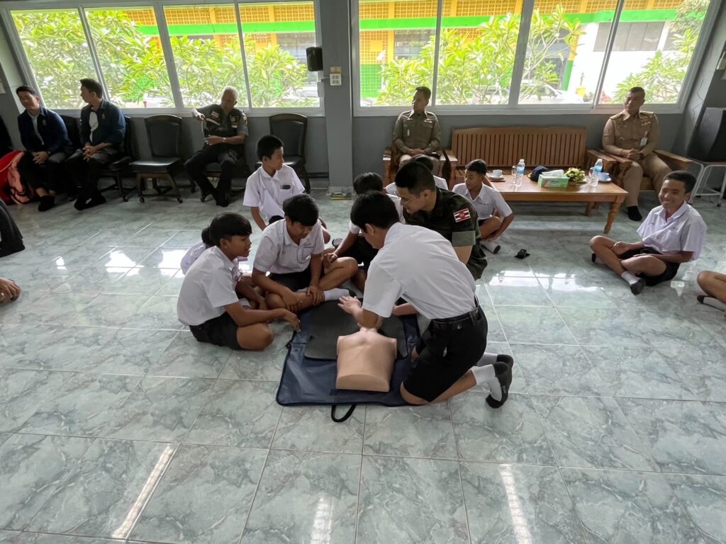 เมื่อ ๑๒ มิ.ย.๖๘ ว่าที่ ร.ต.อริญชย์ จัยสิน ผบ.ร้อย.พ.กอง สนช.กจต. และ จนท.พยาบาลดำเนินการให้ความรู้เรื่องการปฐมพยาบาลการช่วยฟื้นคืนชีพขั้นพื้นฐาน (CPR) และการใช้เครื่องฟื้นคืนคลื่นหัวใจด้วยไฟฟ้าแบบอัตโนมัติ (AED) ให้แก่นักเรียนชั้นมัธยมศึกษาตอนต้น ณ ร.ร.ศรีรัตร์ราษฎร์นุเคราะห์ ต.ทุ่งเบญจา อ.ท่าใหม่ จว.จันทบุรี / พัน.พ.กรม สน.พล.นย. / By ข่าวผู้บังคับบัญชา จำนวนคนดู : 7