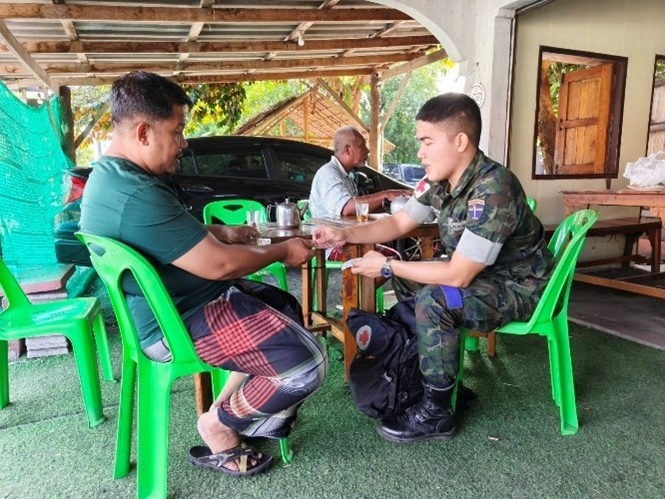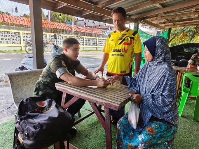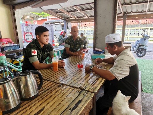 เมื่อ ๑๑ มิ.ย.๖๘ ชป.กร.ร้อย.ปืนเล็กที่ ๑ ฉก.นย.ทร.๓๓ พร้อมด้วย จนท.พยาบาลประจำกองร้อย พบปะพูดคุยสร้างสัมพันธ์กับผู้นำหมู่บ้าน พร้อมทั้งแจกยาสามัญประจำบ้านให้แก่ประชาชนในพื้นที่ ณ ร้านน้ำชาประจำหมู่บ้าน หมู่ที่ ๓ ต.ศาลาใหม่ อ.ตากใบ จว.นราธิวาส / พัน.พ.กรม สน.พล.นย. / By ข่าวผู้บังคับบัญชา จำนวนคนดู : 4