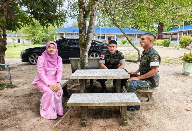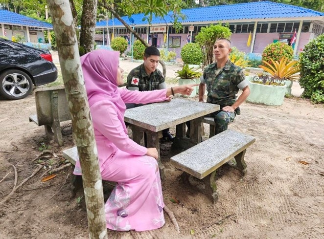 เมื่อ ๑๑ มิ.ย.๖๘ ชป.กร.ร้อย.ปืนเล็กที่ ๑ ฉก.นย.ทร.๓๓ พร้อมด้วย จนท.พยาบาลประจำกองร้อย พบปะเยี่ยมเยียน น.ส.เมเหรัน แซแน ผอ.รร.วัดโคกมะเฟือง พูดคุยสอบถามเกี่ยวกับการเดินทางไป-กลับ ของบุคลากรในโรงเรียน ณ โรงเรียนวัดโคกมะเฟือง หมู่ที่ ๑ บ.โคกมะเฟือง ต.ศาลาใหม่ อ.ตากใบ จว.นราธิวาส / พัน.พ.กรม สน.พล.นย. / By ข่าวผู้บังคับบัญชา จำนวนคนดู : 5