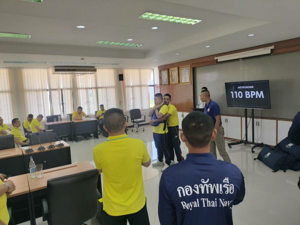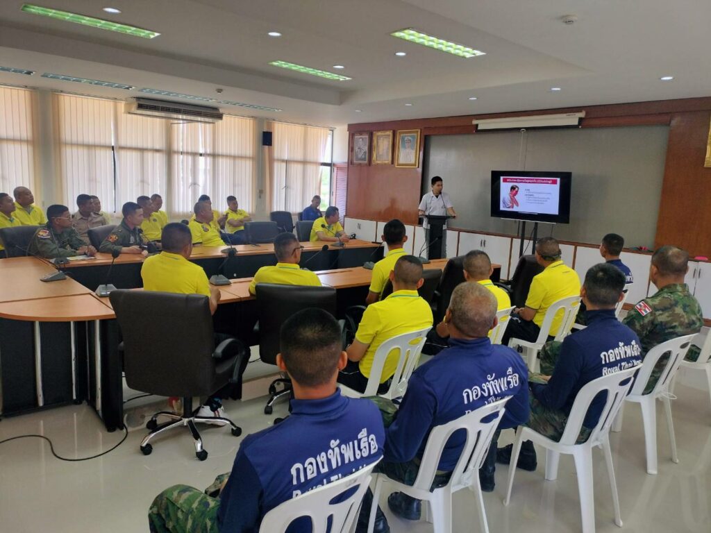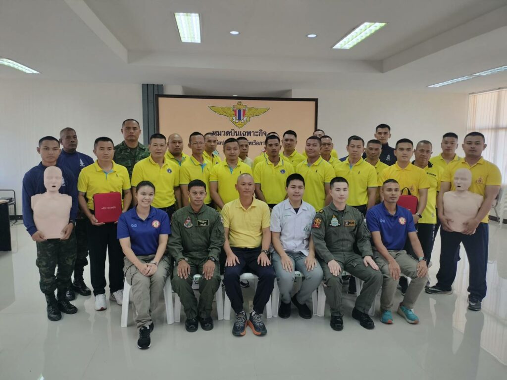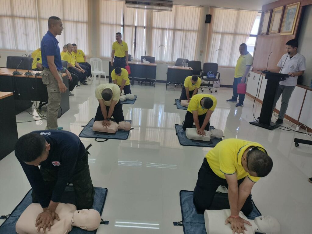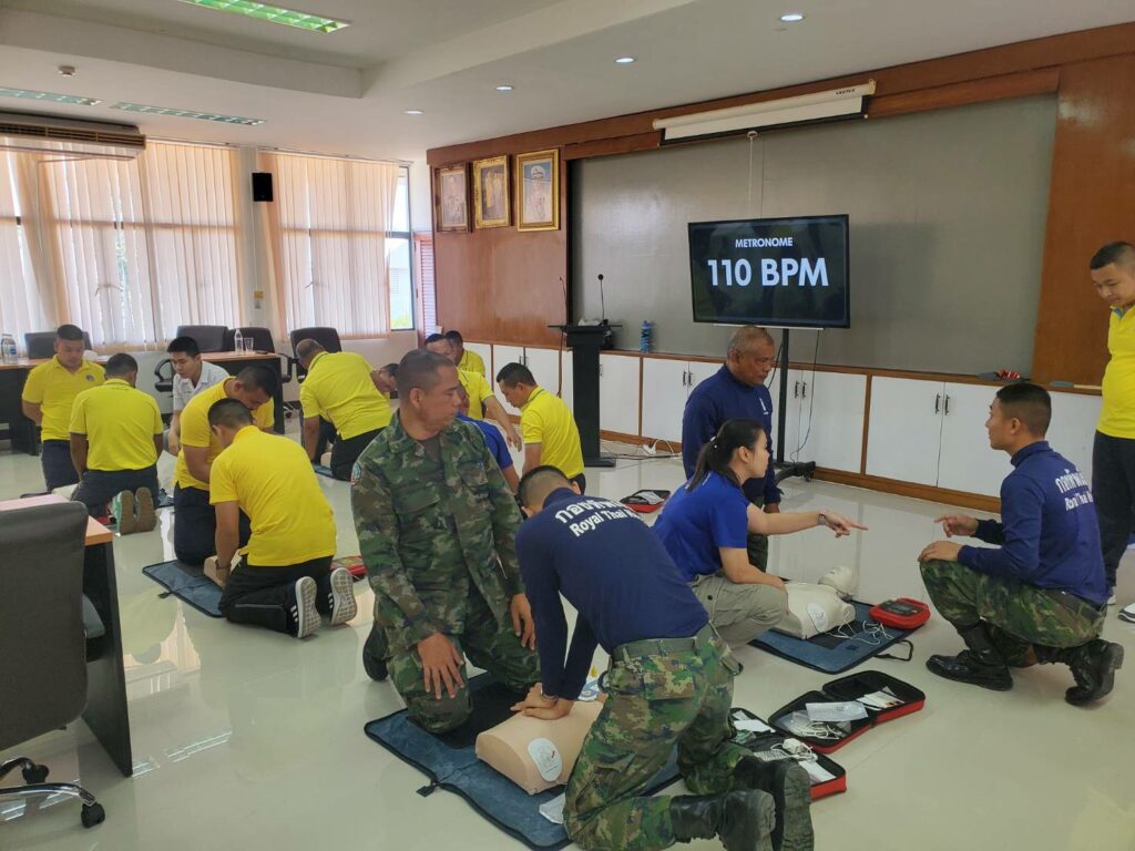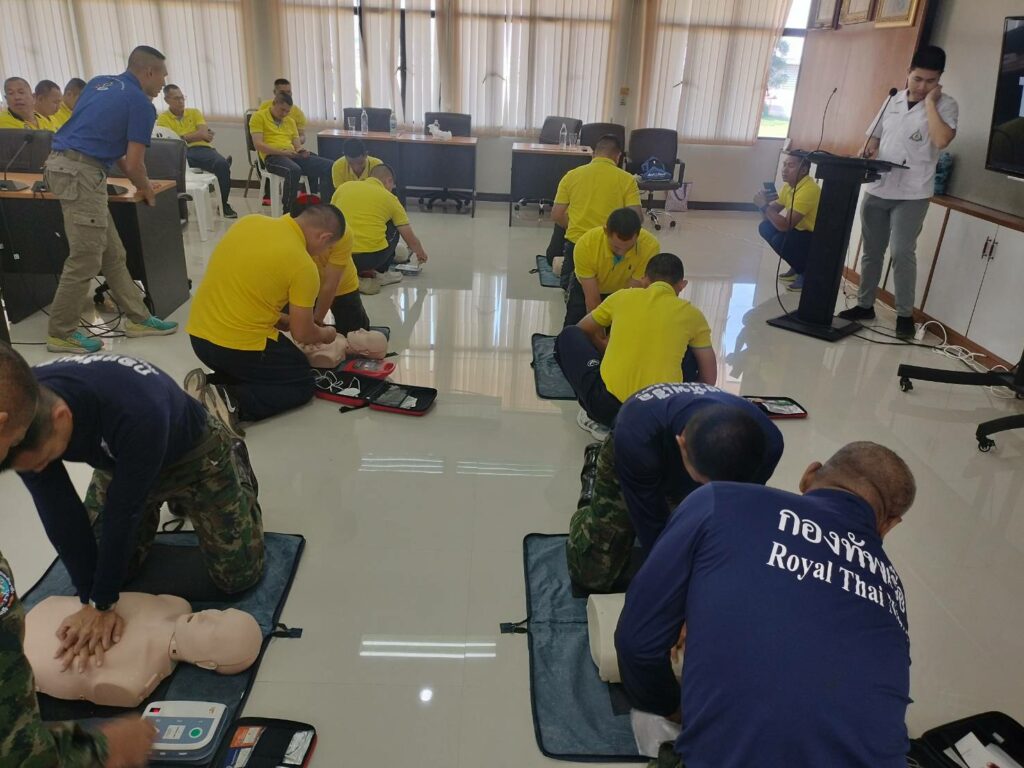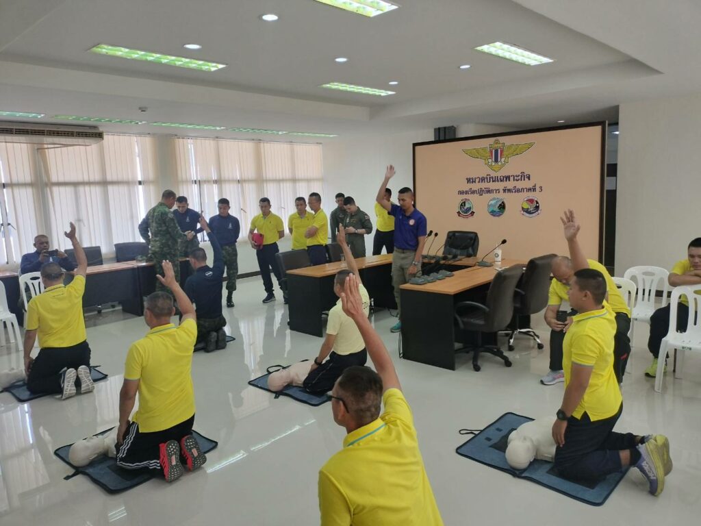 เมื่อ ๑๓ ธ.ค.๖๖ ร.ต.รวินท์ ปัญจมะวัต รอง ผอ.รพ.ฐท.พง.ทรภ.๓ สนับสนุนวิทยากรบรรยายให้ความรู้ ฝึกอบรมการปฐมพยาบาลเบื้องต้น การกู้ชีพขั้นพื้นฐาน(CPR) และการใช้เครื่องฟื้นคืนคลื่นหัวใจด้วยไฟฟ้าแบบอัตโนมัติ(AED) ให้แก่กำลังพล หมวดบินเฉพาะกิจ กองเรือปฎิบัติการ ทัพเรือภาคที่ ๓ ณ ห้องประชุม หมวดบินเฉพาะกิจ / รพ.ฐท.พง.ทรภ.๓ / By ข่าวผู้บังคับบัญชา จำนวนคนดู : 7
