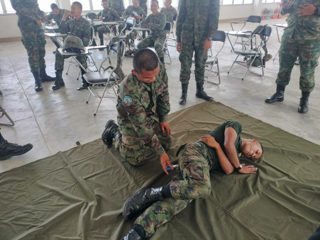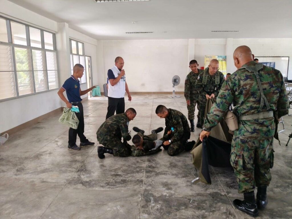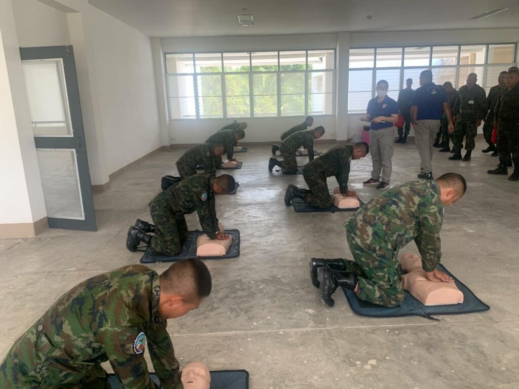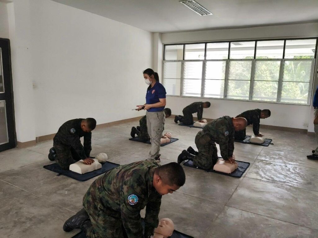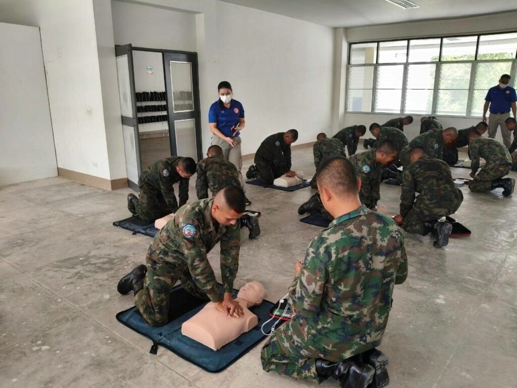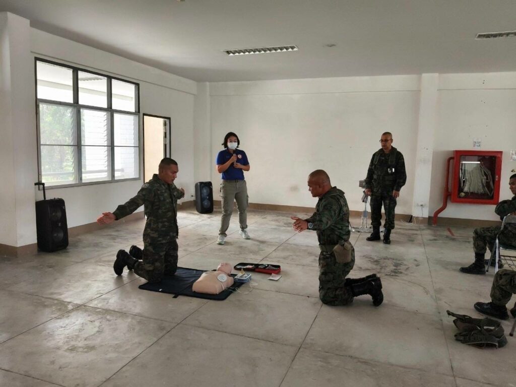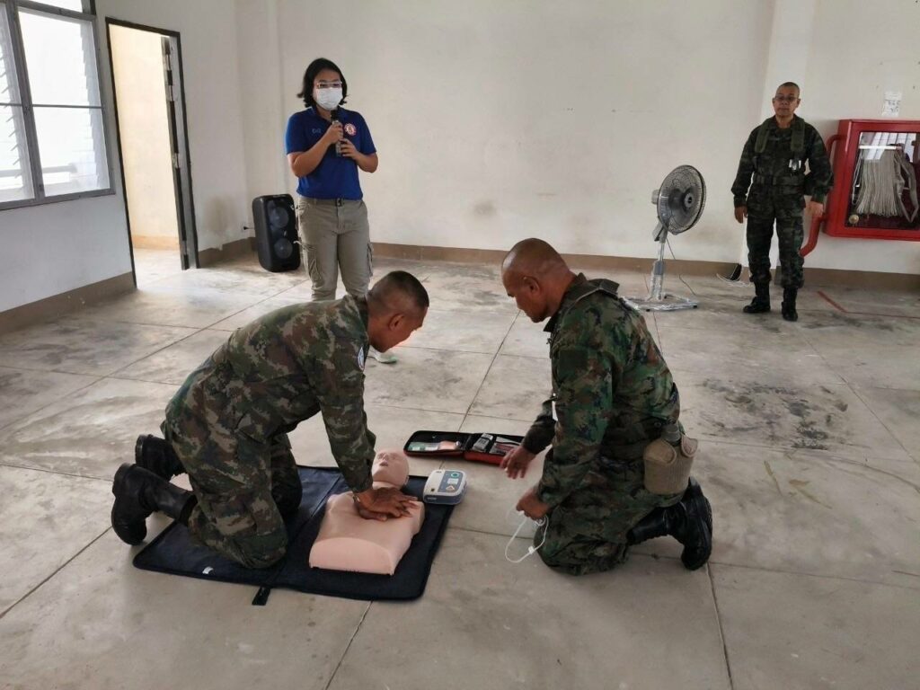 เมื่อ ๓ มี.ค.๖๘ รพ.ฐท.พง.ทรภ.๓. ฝึกอบรมทบทวนการปฐมพยาบาล การกู้ชีพขั้นพื้นฐาน (CPR) การใช้เครื่องฟื้นคืนคลื่นหัวใจด้วยไฟฟ้าแบบอัตโนมัติ (AED) และการเฝ้าระวังป้องกันอันตรายจากความร้อน (Heat stroke) ให้แก่ กำลังพลพัน สอ.๒๒ ณ อาคารร้อยป้องกัน พัน สอ.๒๒