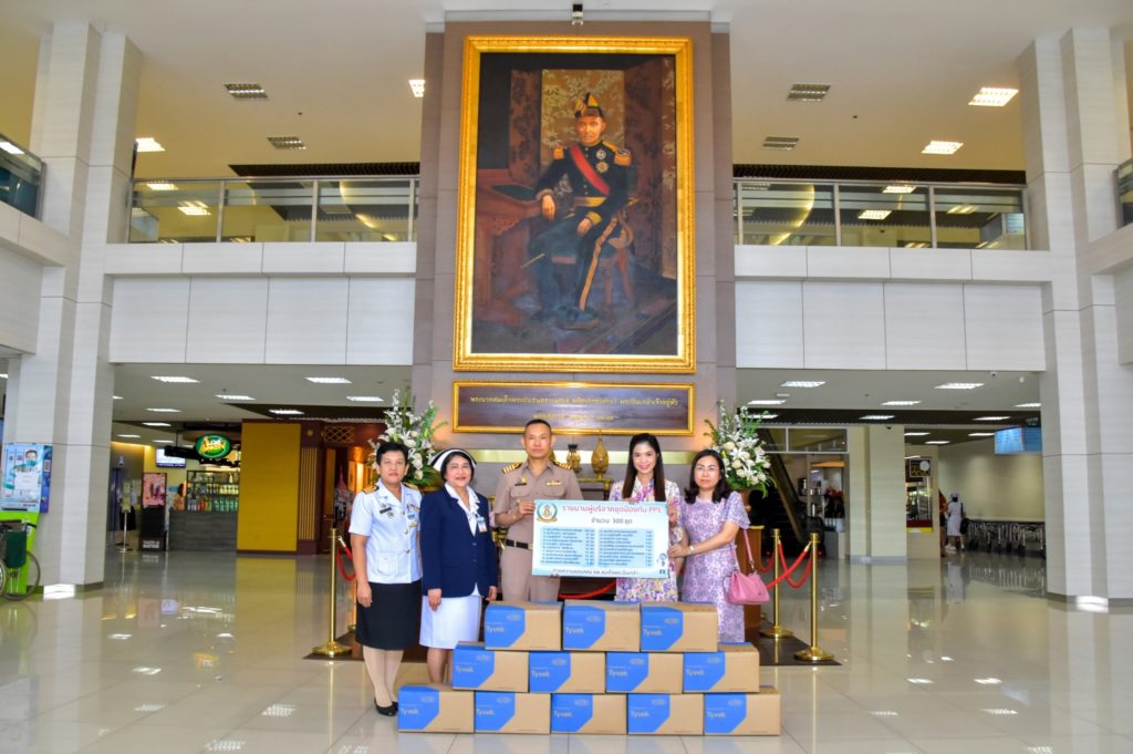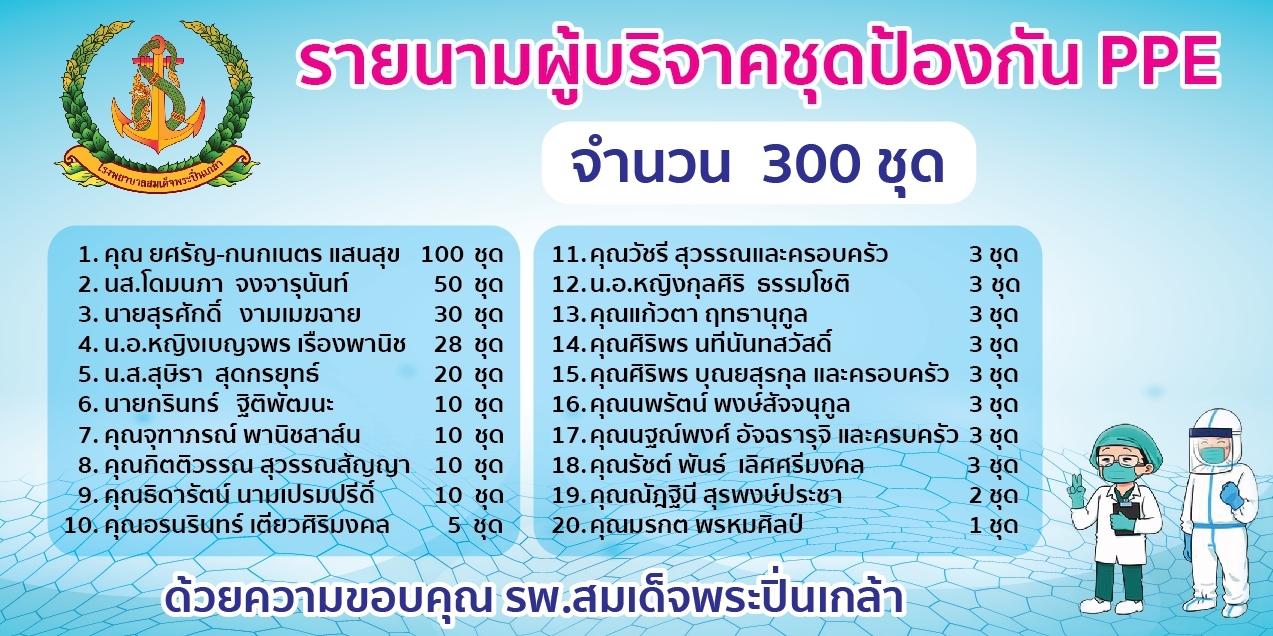 นาวาเอก สมชาย จันทโรธร รองผู้อำนวยการโรงพยาบาลสมเด็จพระปิ่นเกล้า กรมแพทย์ทหารเรือ ฝ่ายบริการสุขภาพ นาวาเอกหญิง กรองทิพย์ จันทร์อินทร์ รอง ผู้อำนวยการโรงพยาบาลสมเด็จพระปิ่นเกล้า กรมแพทย์ทหารเรือ ฝ่ายการพยาบาล และคณะ รับมอบชุดป้องกัน PPE จำนวน ๓๐๐ ชุด บริจาคโดยคุณยศรัญ – คุณกนกเนตร แสนสุข และคณะ เพื่อบุคลากรทางการแพทย์ โรงพยาบาลสมเด็จพระปิ่นเกล้า กรมแพทย์ทหารเรือ เมื่อวันที่ ๑๘ มีนาคม พ.ศ.๒๕๖๓