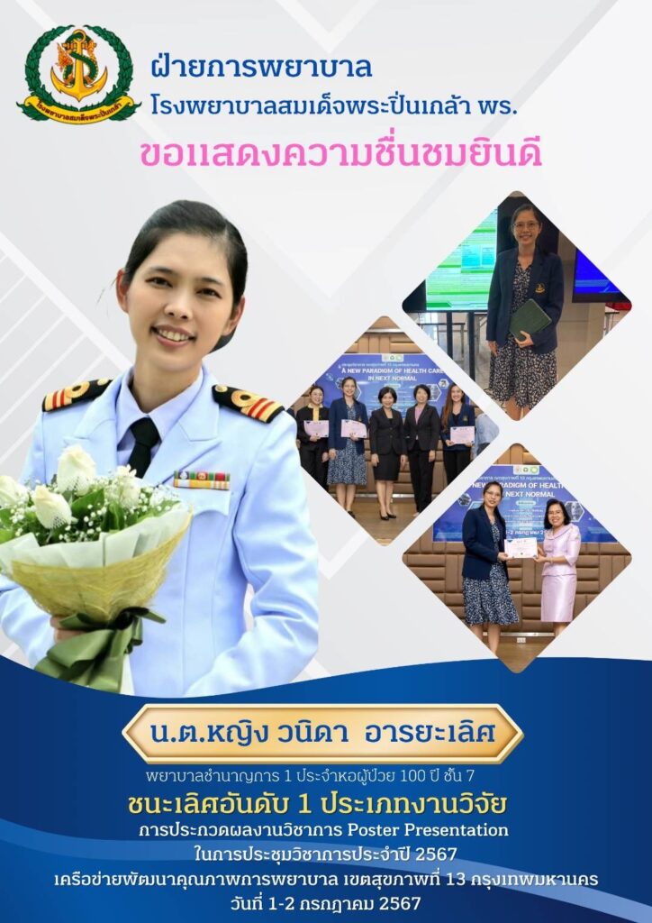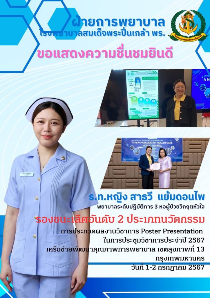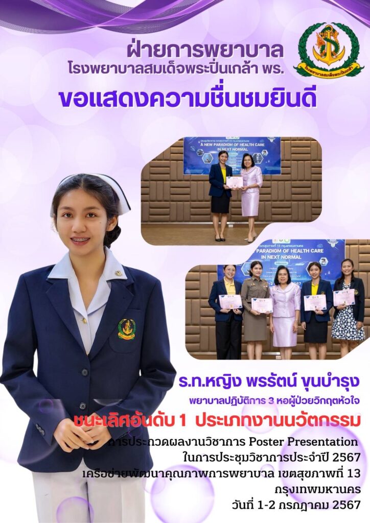 ระหว่าง ๑ – ๒ ก.ค.๖๗ รพ.สมเด็จพระปิ่นเกล้า พร. ขอแสดงความชื่นชมยินดีกับพยาบาล รพ.สมเด็จพระปิ่นเกล้า พร. ฝ่ายการพยาบาล ได้รับรางวัลจากการประกวดผลงานวิชาการ Poster Presentation ในการประชุมวิชาการประจำปี ๒๕๖๗ เครือข่ายพัฒนาคุณภาพการพยาบาล เขตสุขภาพที่ ๑๓ กรุงเทพมหานคร